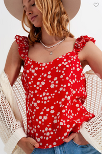 FRILL STRAP CAMI TOP IN RED DITSY FLORAL PRINT