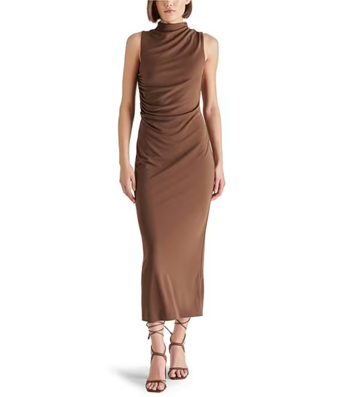 This sleeveless, jersey-knit dress features a mock neckline and ruched detailing. Dress it up or down!