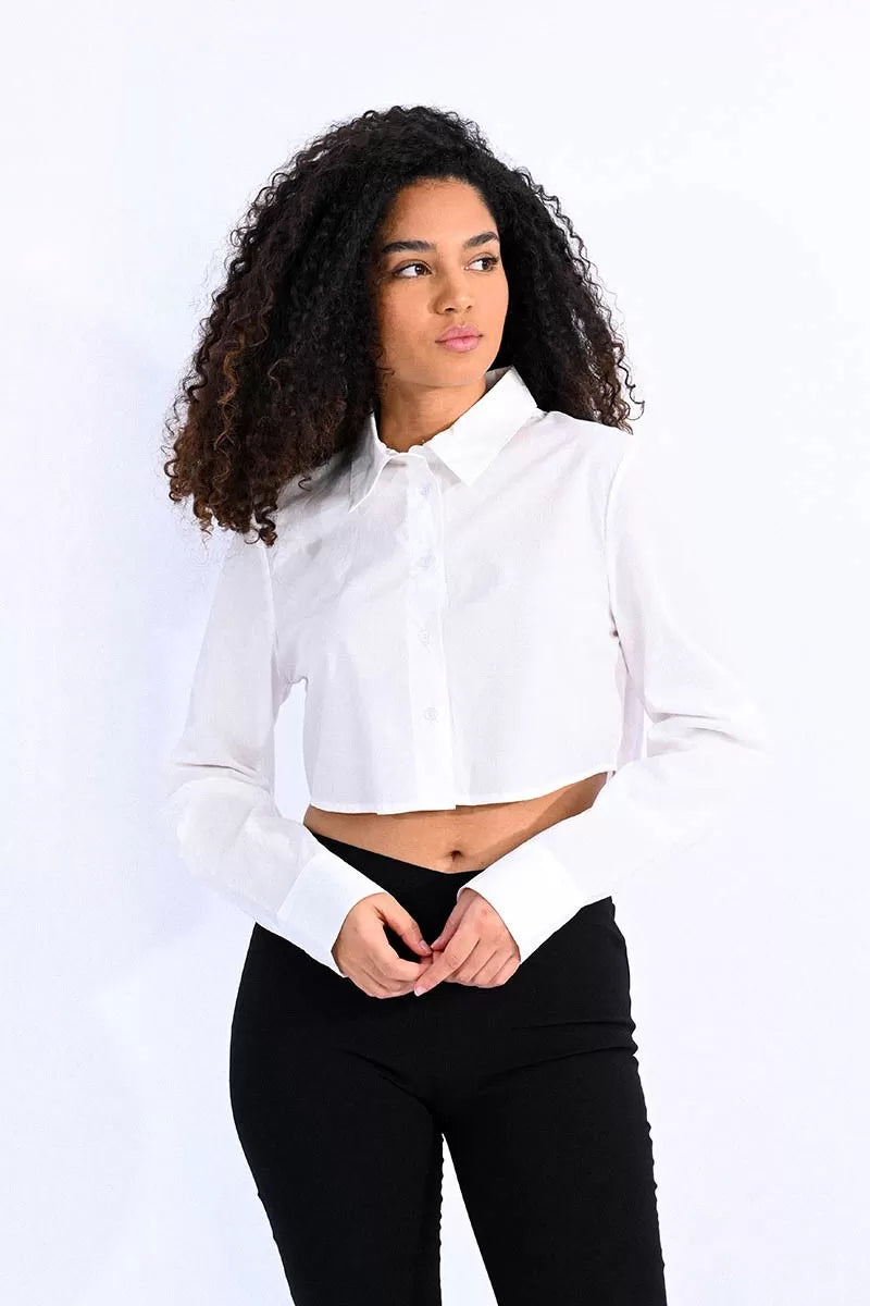 Cropped silhouette in white Lyocell and cotton, with front button closure.
