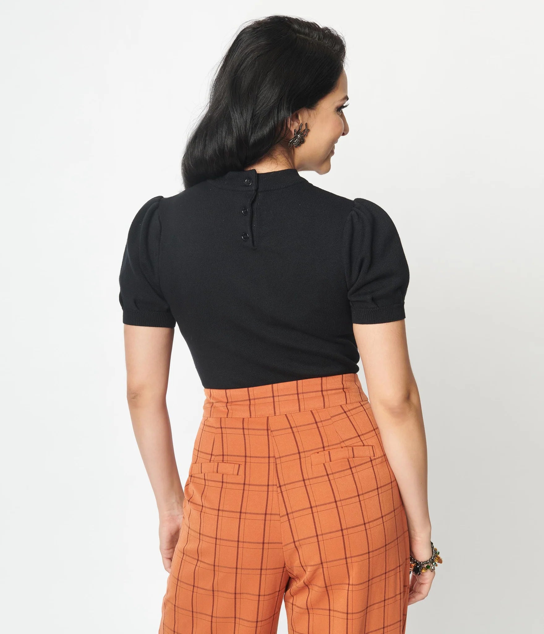 This bewitching sweater is crafted in a fabulously soft knit blend that boasts a classic fair isle pattern with a spooky twist featuring black and white witches and jack-o-lantern moons throughout the black silhouette. Complete with scoop neck and short sleeves.