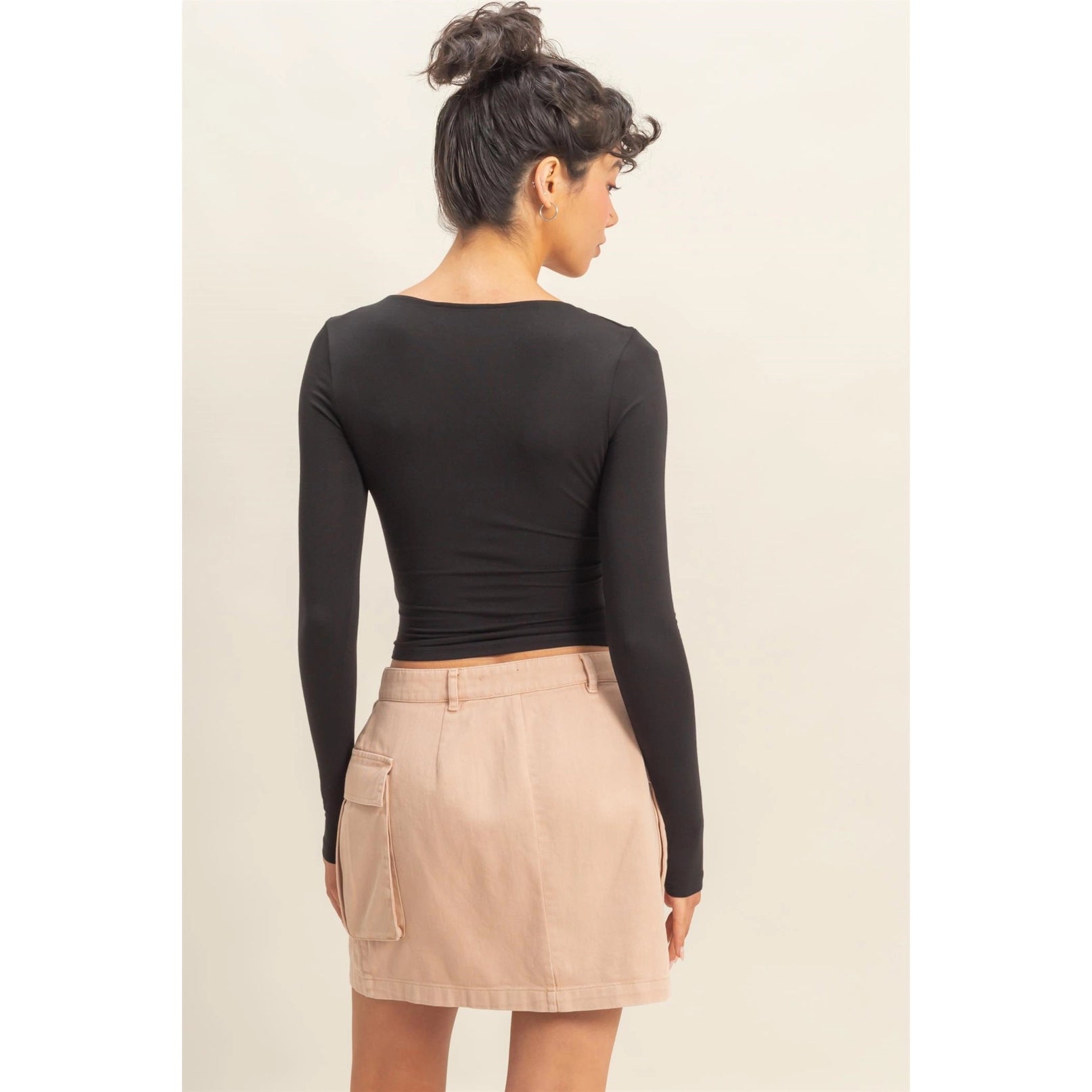 This scoop neck crop top features long sleeves and a form-fitting design. The soft and stretchy fabric ensures comfort while maintaining a chic silhouette.