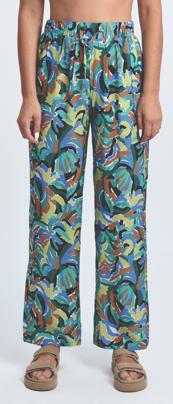 Wide leg pants with an all-over print, elastic waistband, and side pockets.