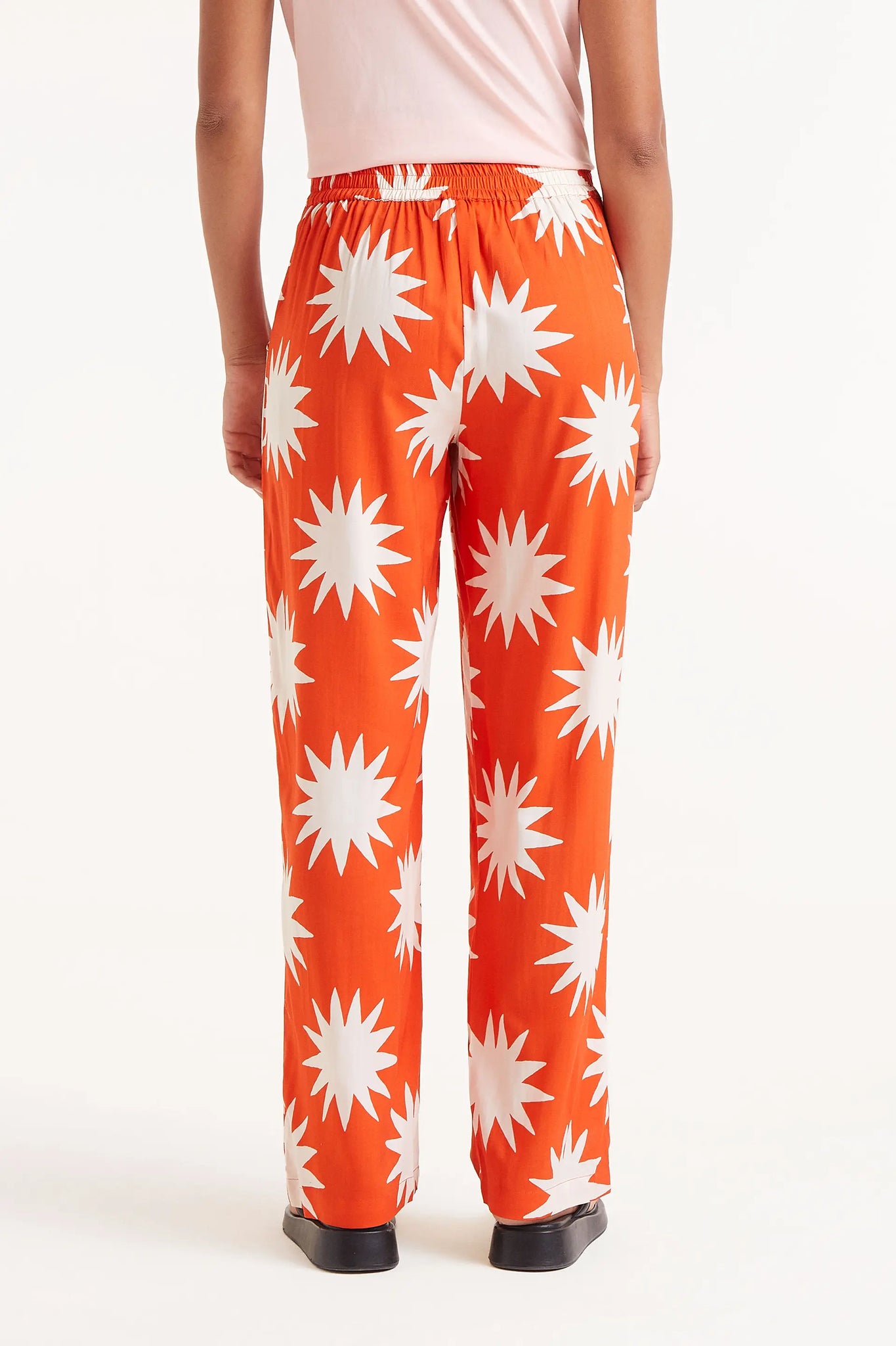 Long trousers with a large sun print. Featuring a fixed front waistband and elasticated back, a mid-rise waist, a straight leg silhouette, and side pockets.
