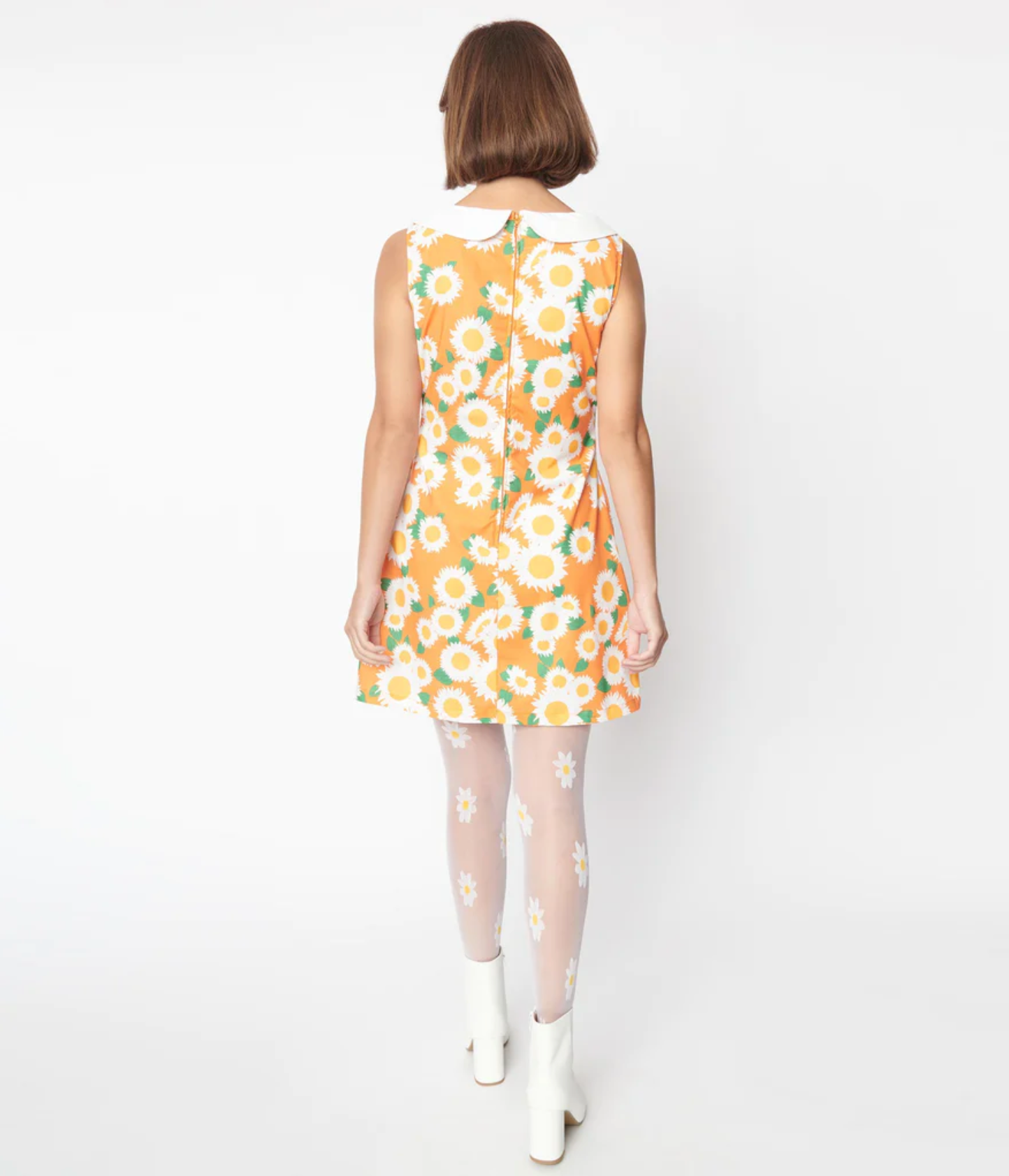 Light up the room with this charming 1960s style mod shift dress! Crafted in a beautiful orange woven fabric, dancing with lovely sunflowers throughout. The peter pan collar adds an extra touch to the casual, yet playful silhouette. Complete with side pockets to keep all your sunshine.