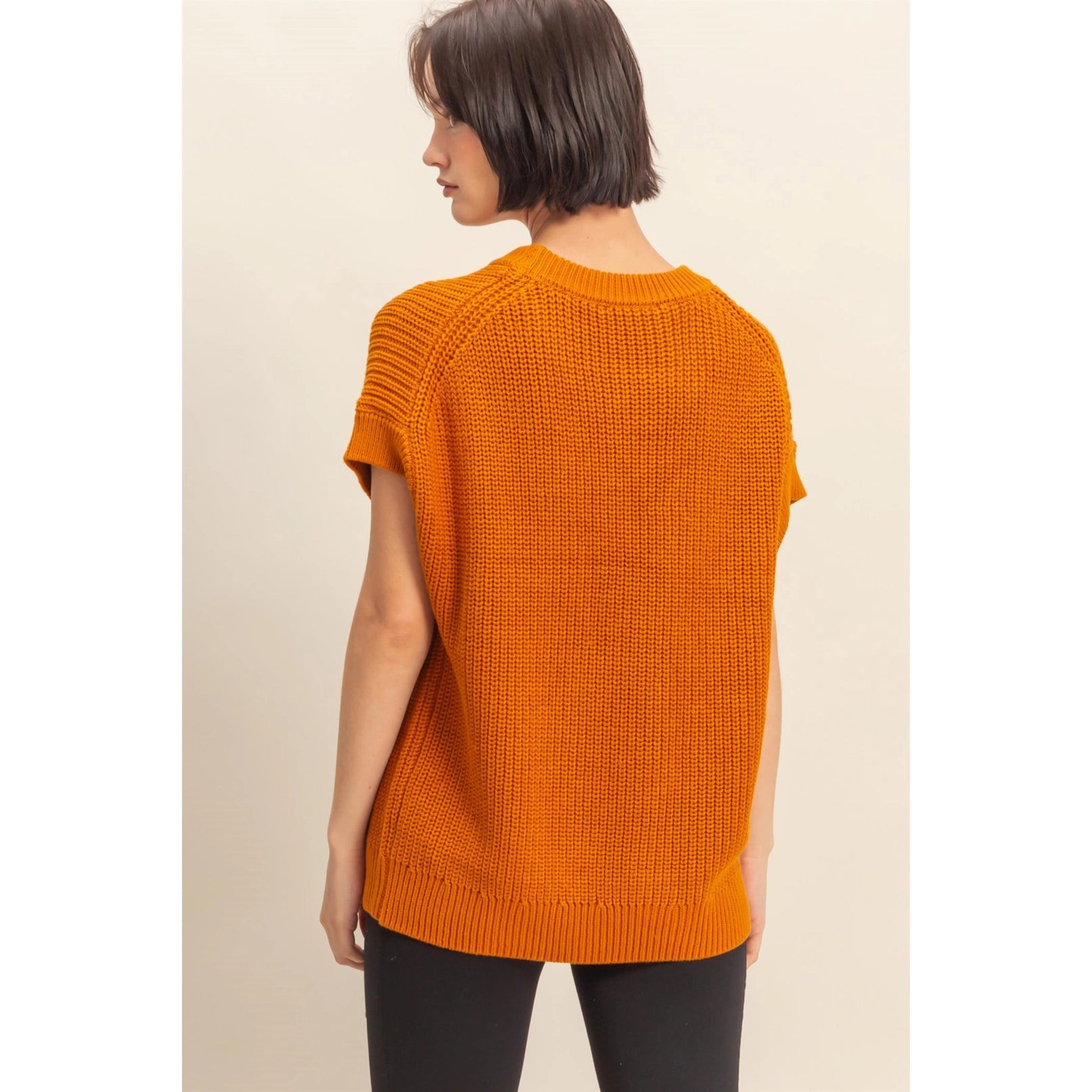 This sweater features a crew neckline and dolman short sleeves. The oversized bodice has a straight, long silhouette. Ribbed knit accents the neckline, sleeves, and hem.
