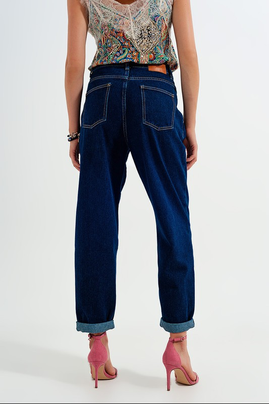 Jeans with a regular rise, belt loops, five pockets, and relaxed fit in non-stretch denim. Dark blue wash.