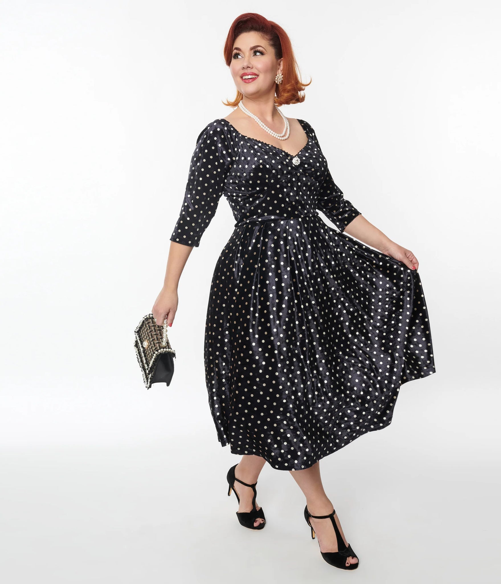 The Lamar Dress is cast in a beautiful black textured velvet dancing with white polka dots throughout. The stunning sweetheart neckline features a sparkling rhinestone faux button. Outfitted with a back zipper and side pockets.