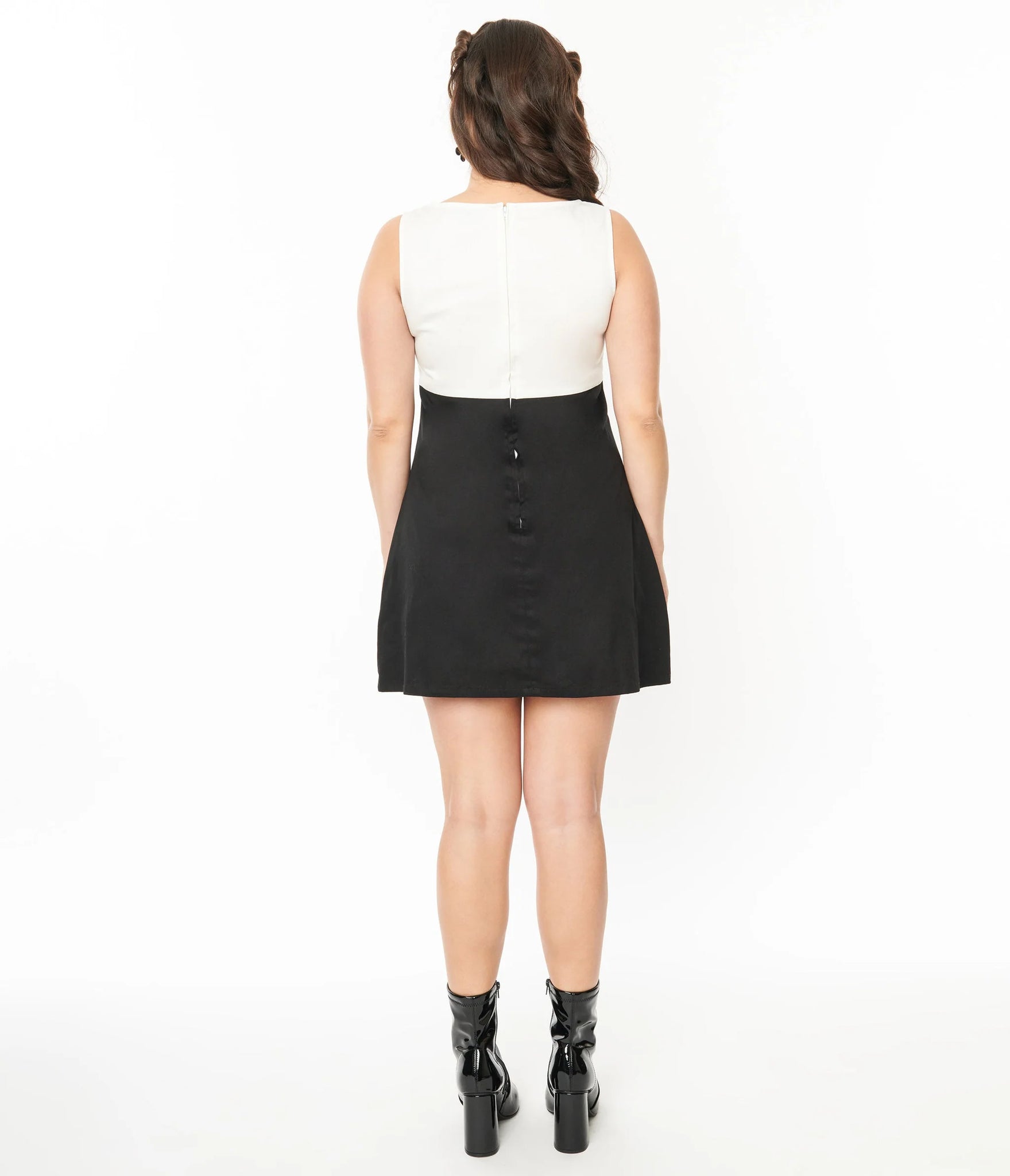 Get down with this groovy 1960s box style shift dress! Crafted in a black and white fabric color block and embroidered with a spooky pumpkin head. The casual silhouette features a straight hemline that drops high above the knees for extra flare!