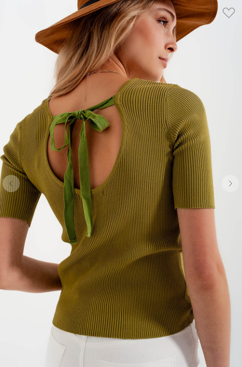 Cream fine-knit canale sweater with knotted detail on the back and short sleeves 65% Viscose 35% Polyamide Model is wearing size S. Model is: 32-24-35 Height: 5'9'' Bodycon Fit.