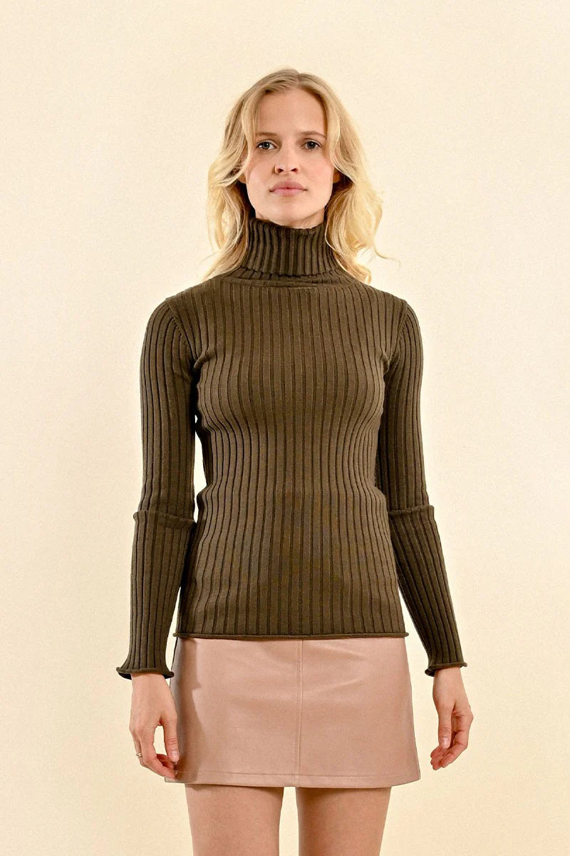 Ribbed knit turtleneck sweater with long sleeves and flared cuffs with a rolled finish.