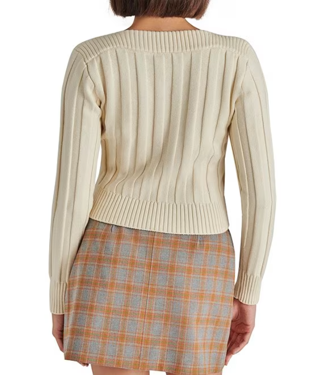 Ribbed knit sweater with boat neckline and long sleeves. Made from viscose, polyester, and nylon.