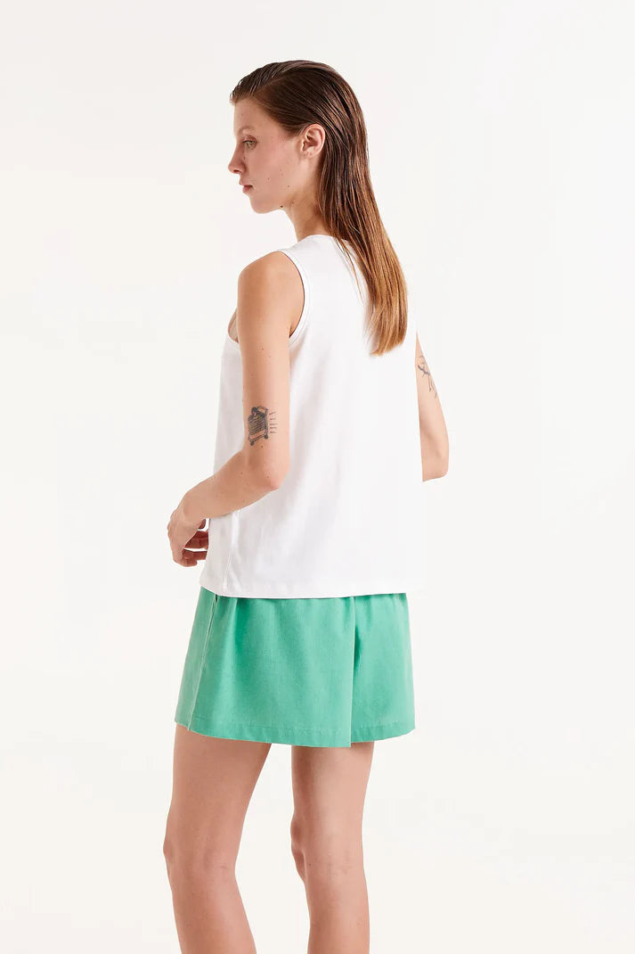 White knit tank top with a raised pineapple detail. Round neck and sleeveless.