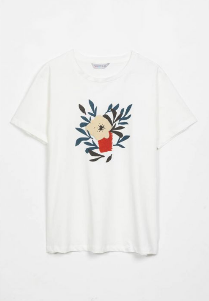 shirt with white flower design. Rounded neck. Short sleeves. Model wears size S.