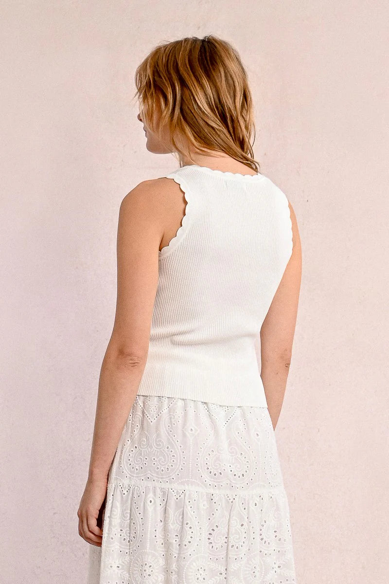 This rib knit tank top has wide straps and a V neckline. The armholes and neckline are also finished with a scalloped trim.
