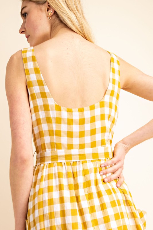 Still adorable for the Fall season, this yellow plaid dress is 100% cotton. Super soft and light, this dress would pair well with white sneakers! Scoop neck. Comes with a tie for the front, and even better - pockets!