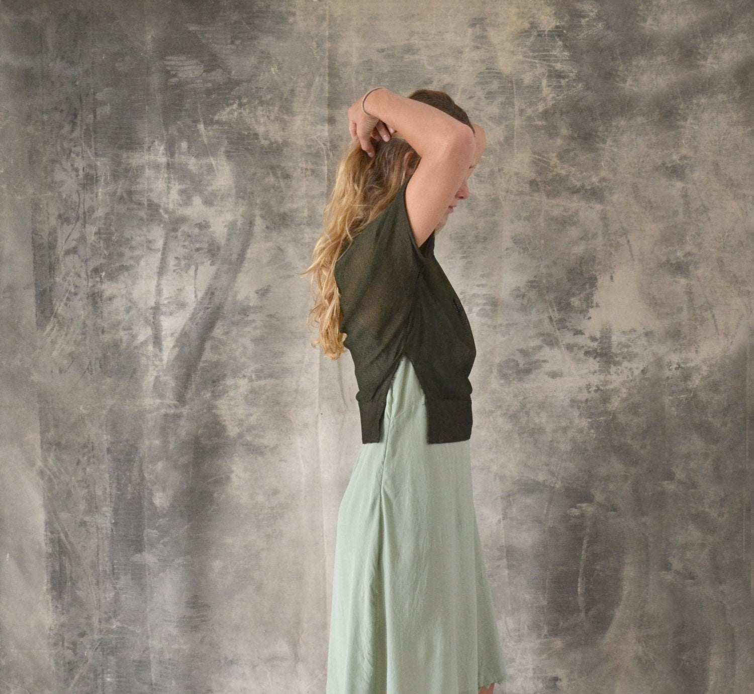 Rare deep green rayon jersey blouse circa 1920s. Loose knit with metal snaps at each side of waist. Left side has 3" opening for snaps while right side has a 7" opening. 3" silk border on interior hem. In fragile condition with several holes in fabric (last image) Fits a women's size small.