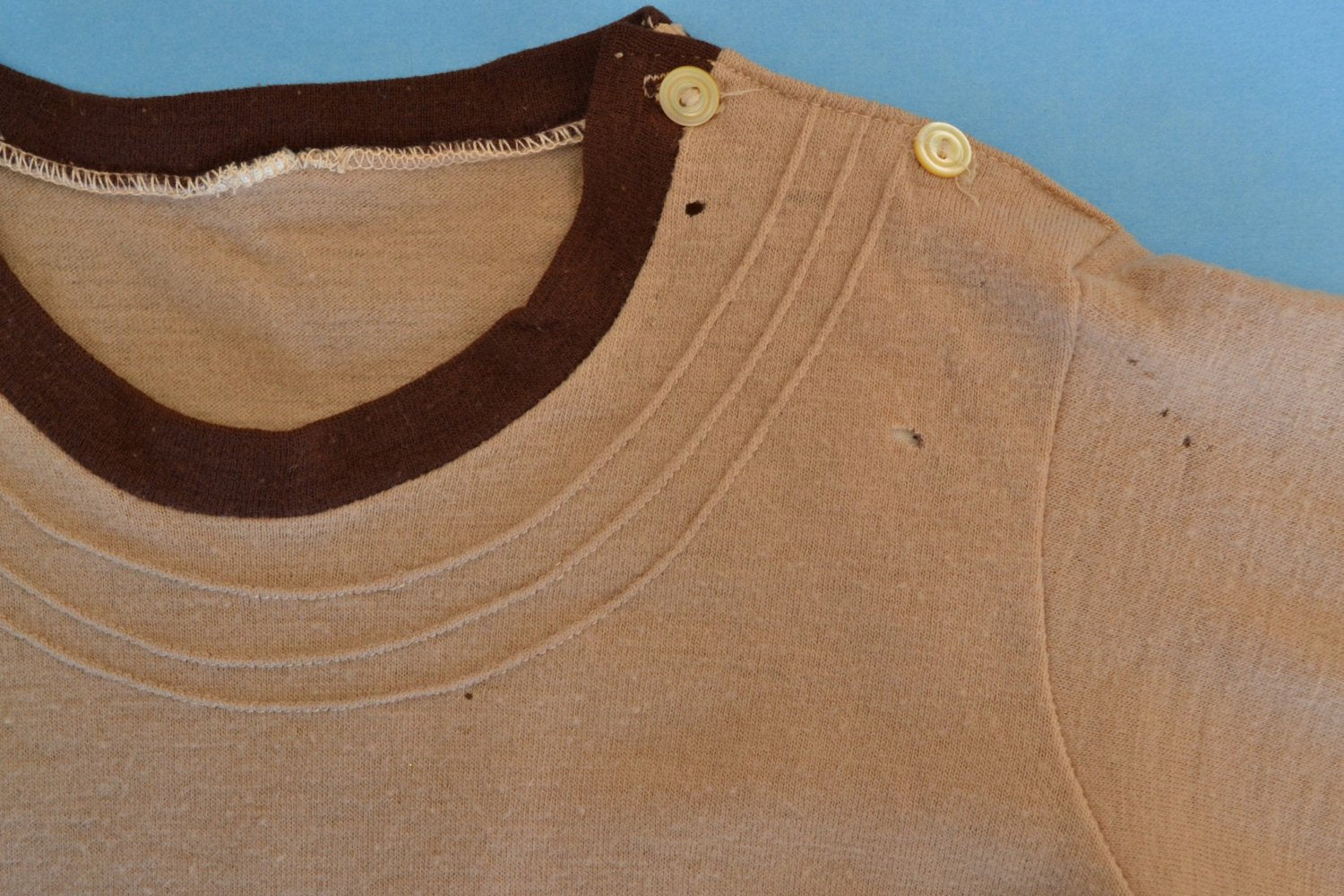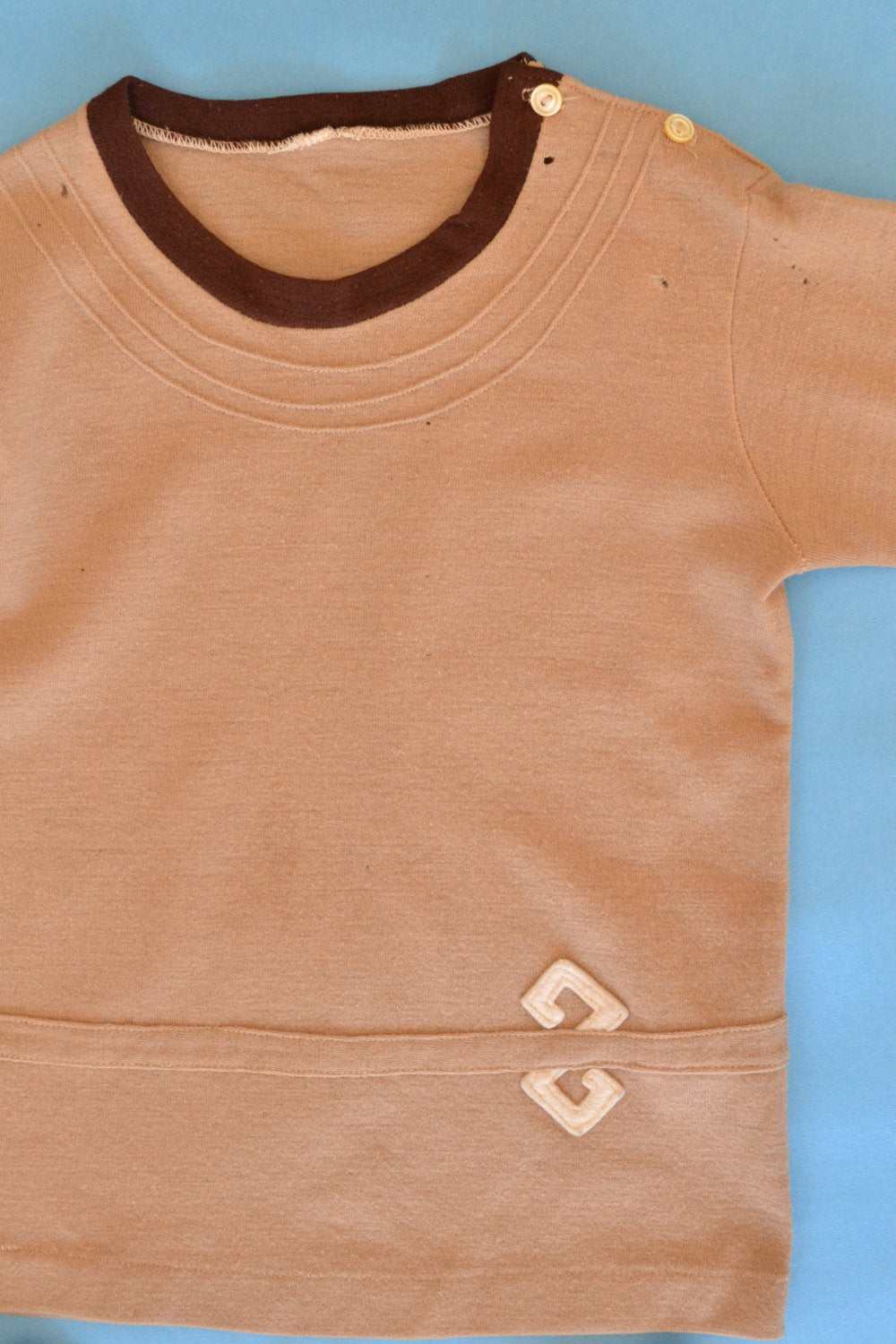 Child's brown wool gym uniform circa 1920s or 30s. Two pieces: dark brown wool shorts with elastic at back of waist, long sleeve light brown top with two buttons at left shoulder. Good condition considering age although with some small moth holes in both pieces.