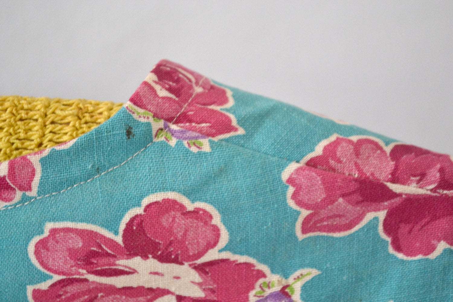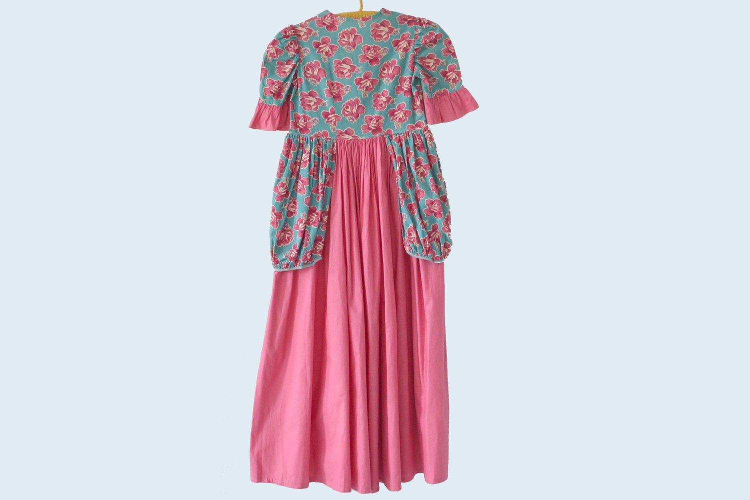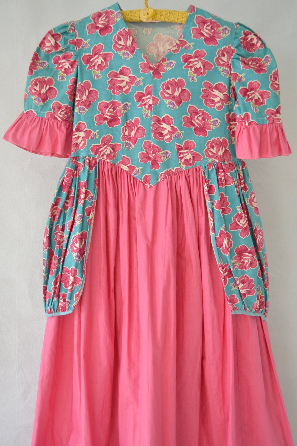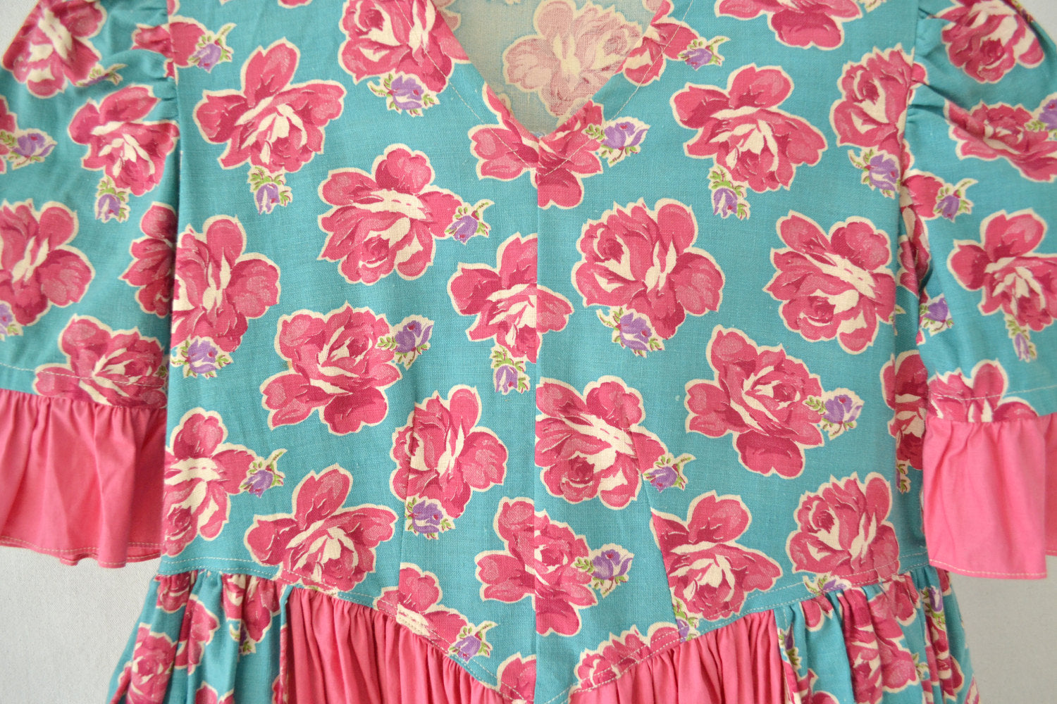 Handmade cotton child's feedsack floral dress circa 1930s. Bright pink and teal cotton with pink and purple roses. Features ruffle sleeves and side panels. In beautiful condition, one small mark on back of neck.