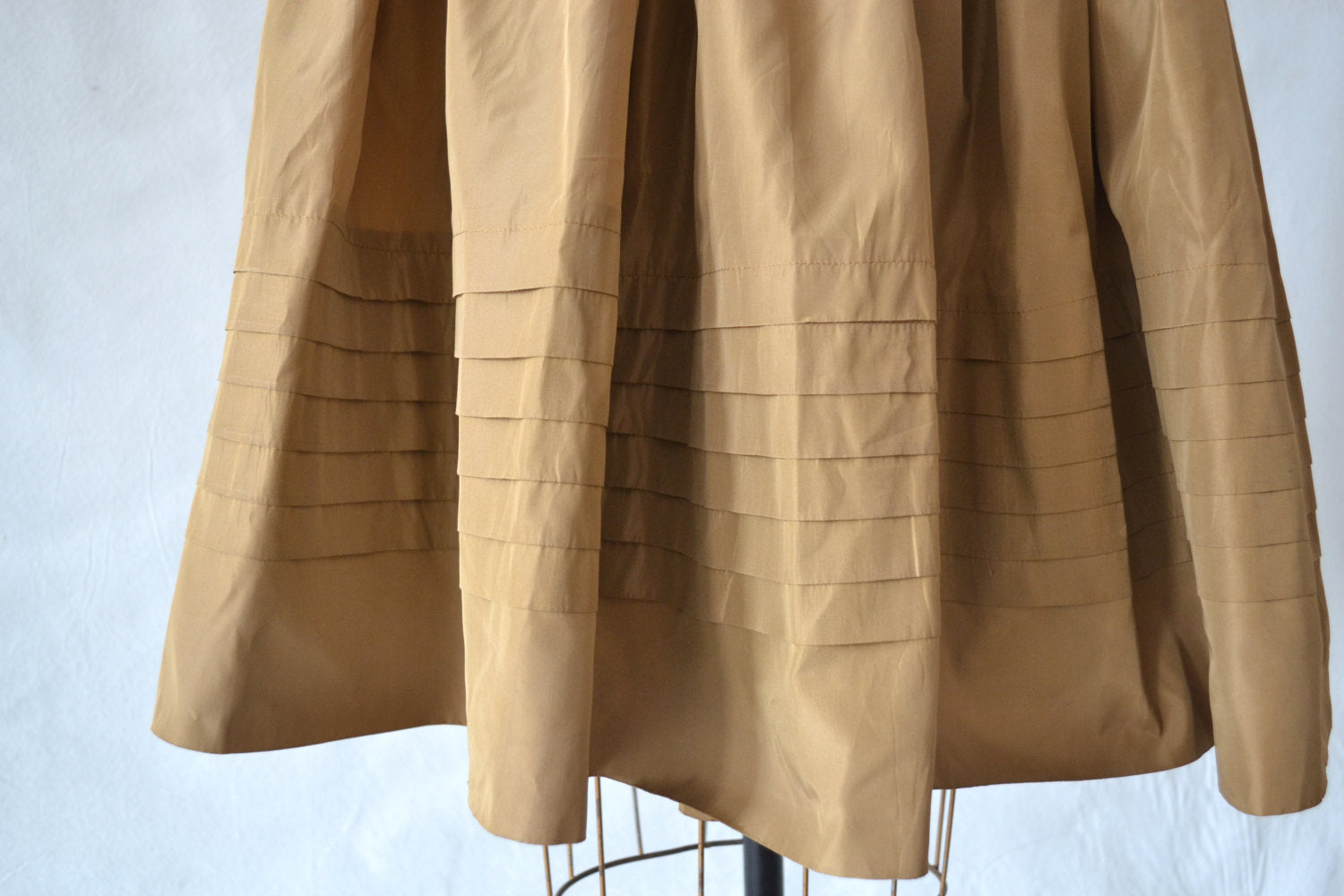 Gold satin dress circa 1950s. Color is gold with a green tone, beautiful satin with a slight sheen. Label is Anne Fogarty. Features full skirt with horizontal pleat detail at hem (third image) and two side pockets. In beautiful condition although with some faint stains and discoloration, small pin size holes, small tear along seam at back of neck (forth image) and 1/2" tear near back left underarm. Fits a women's size XS.
