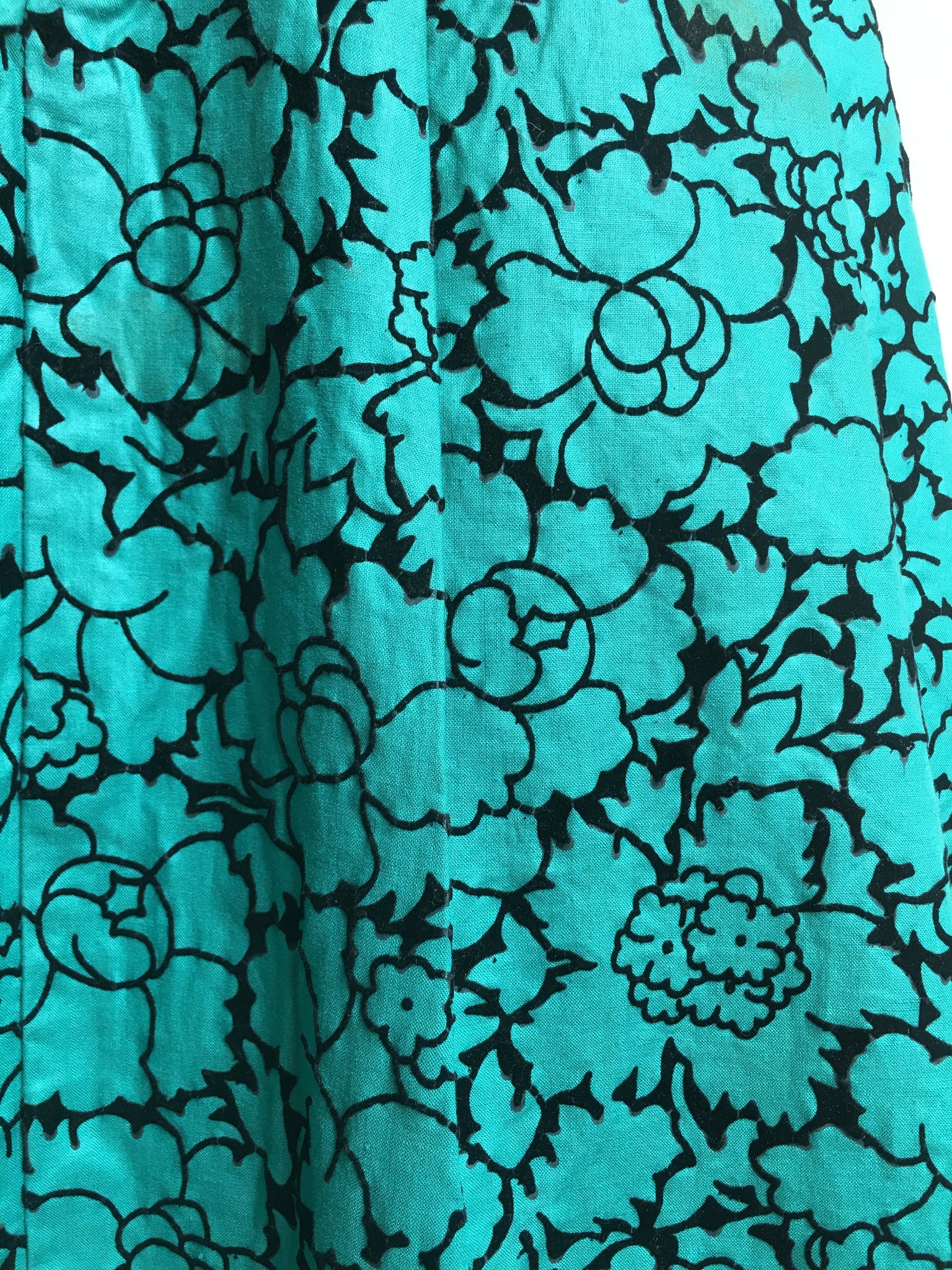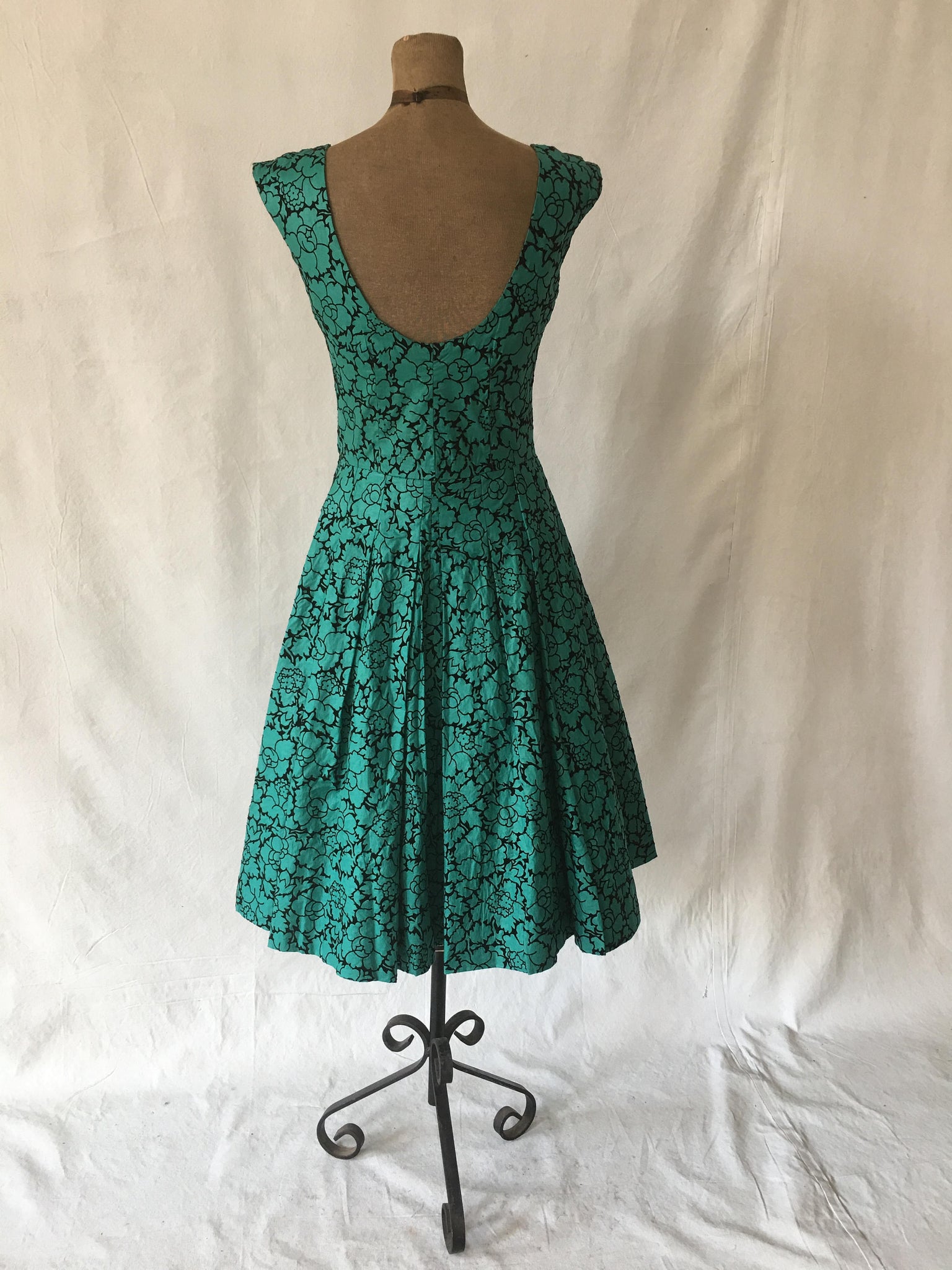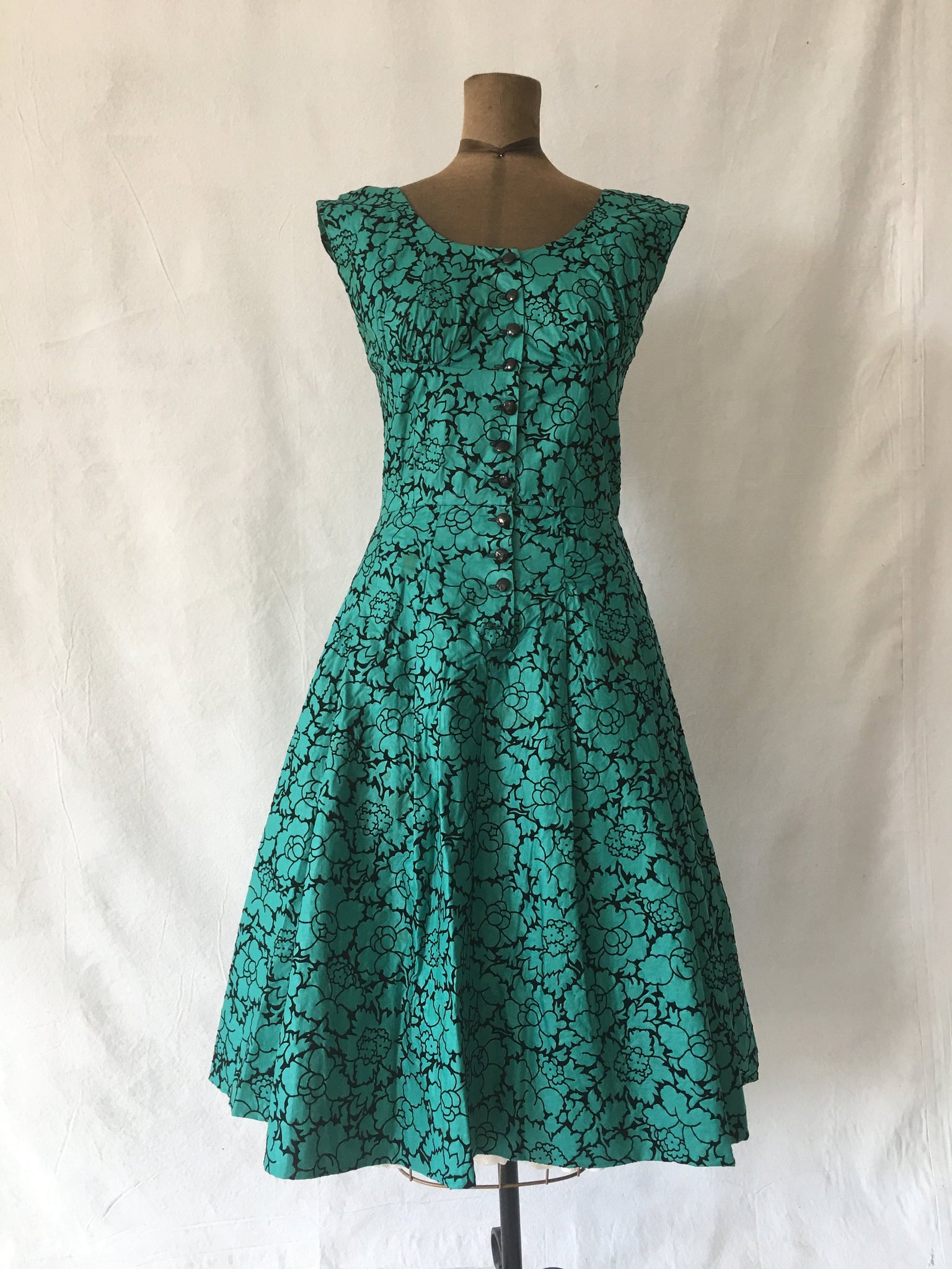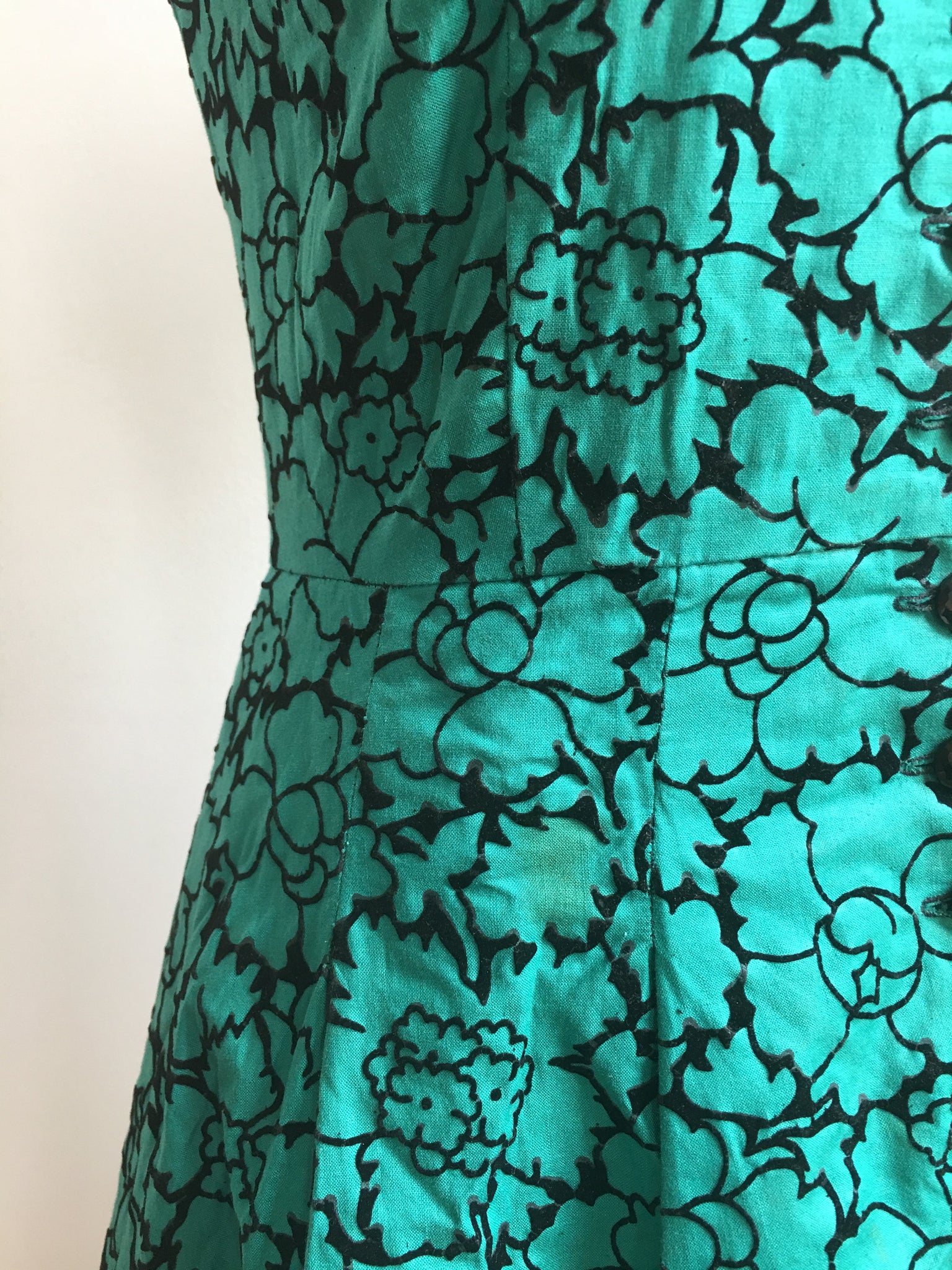This is a pretty, handmade, party dress from the 1950s. The material is polished cotton, with velvet flocking.