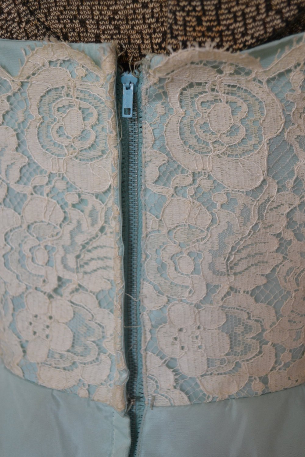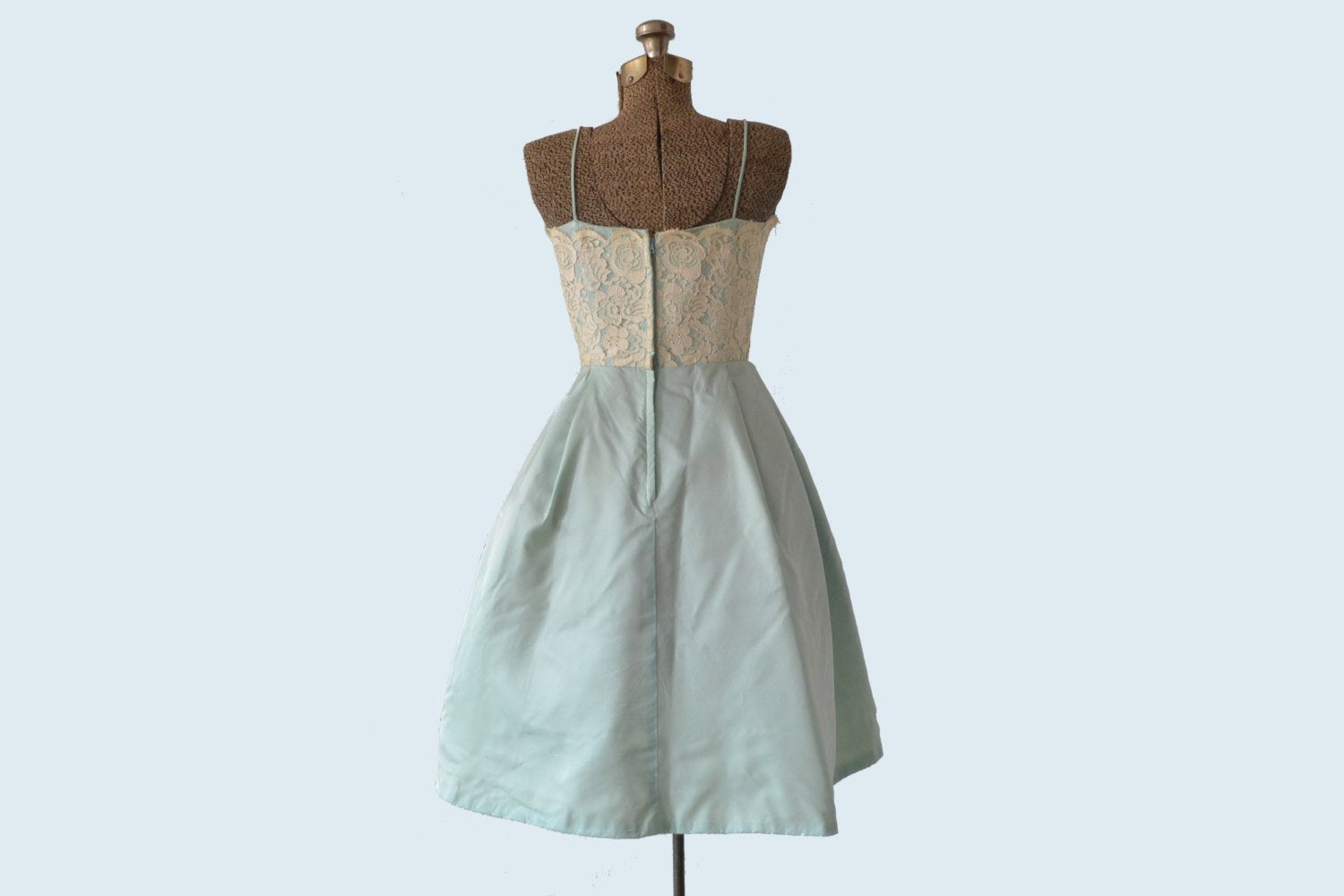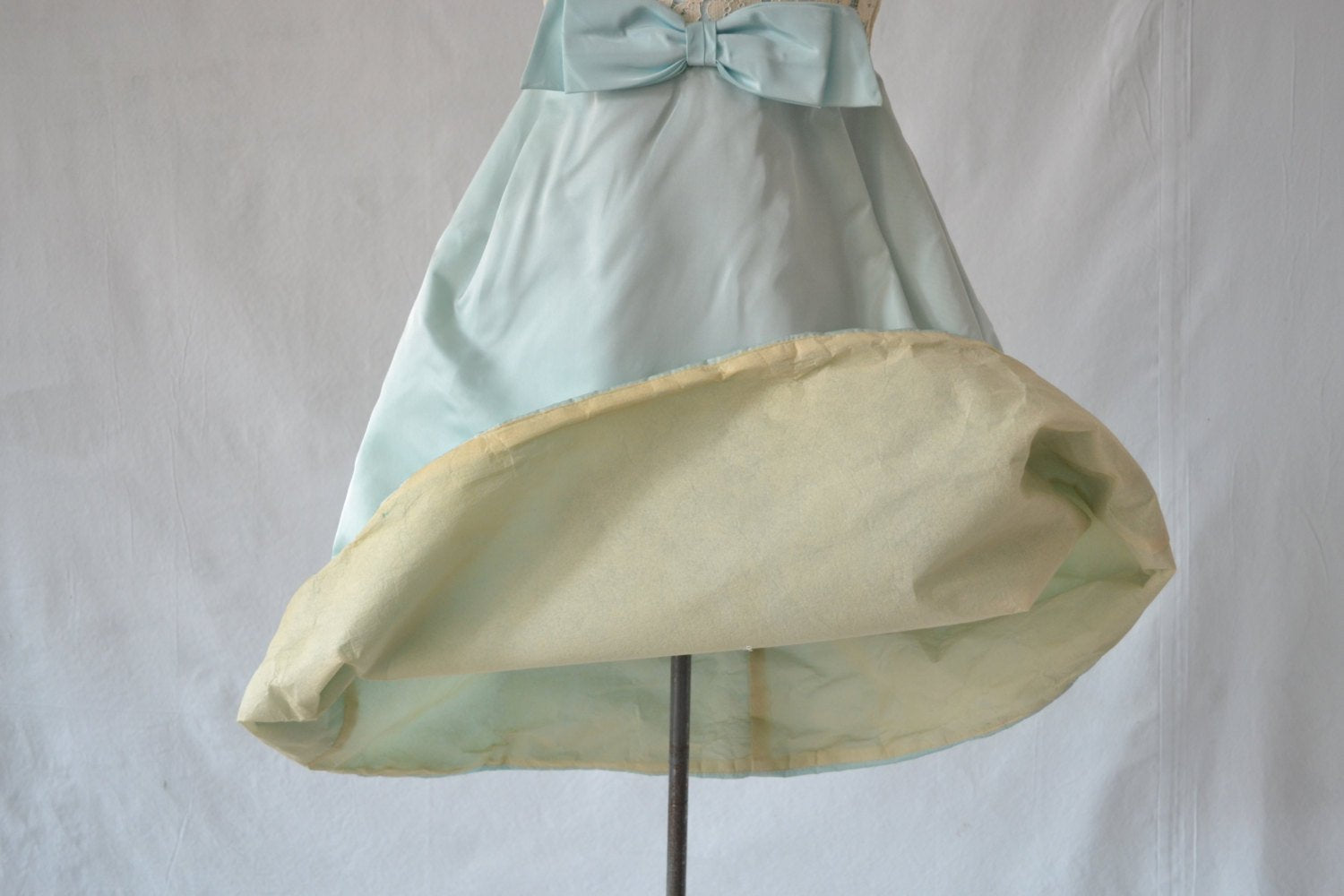 Powder blue party dress circa 1950s. Features lace bodice and delicate thin straps, large bow at waist and crinoline lining attached in skirt. Zips up back with 13" metal zipper. In beautiful condition. Fits a size XS