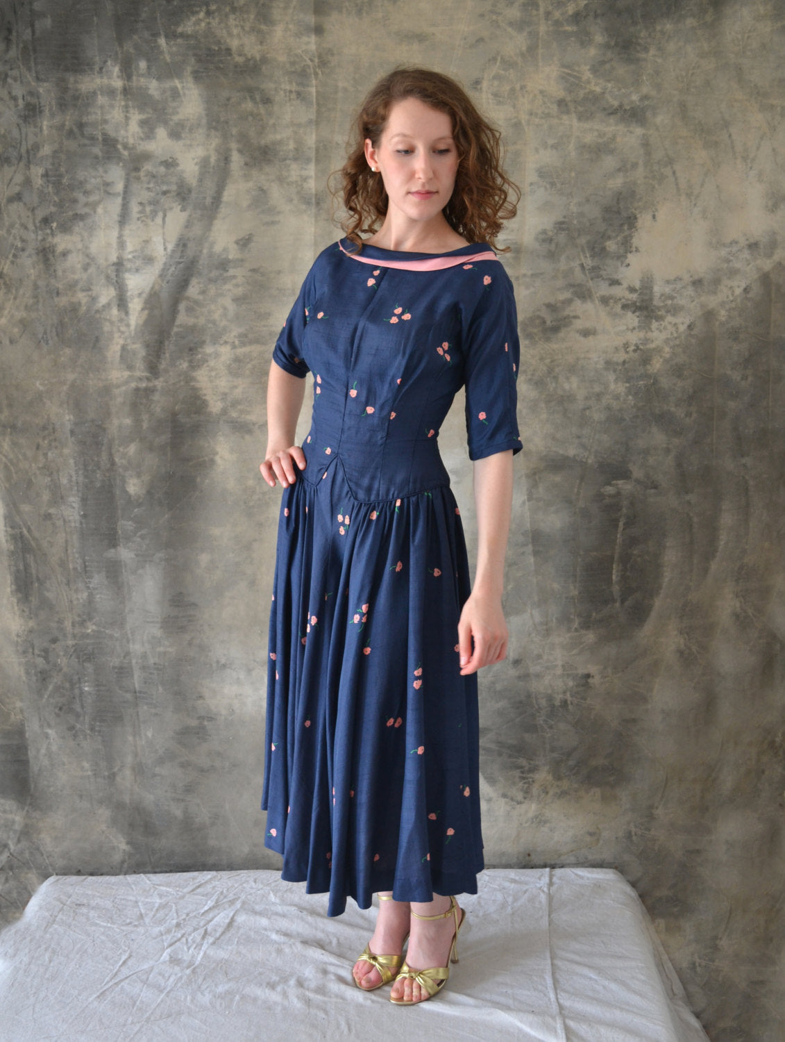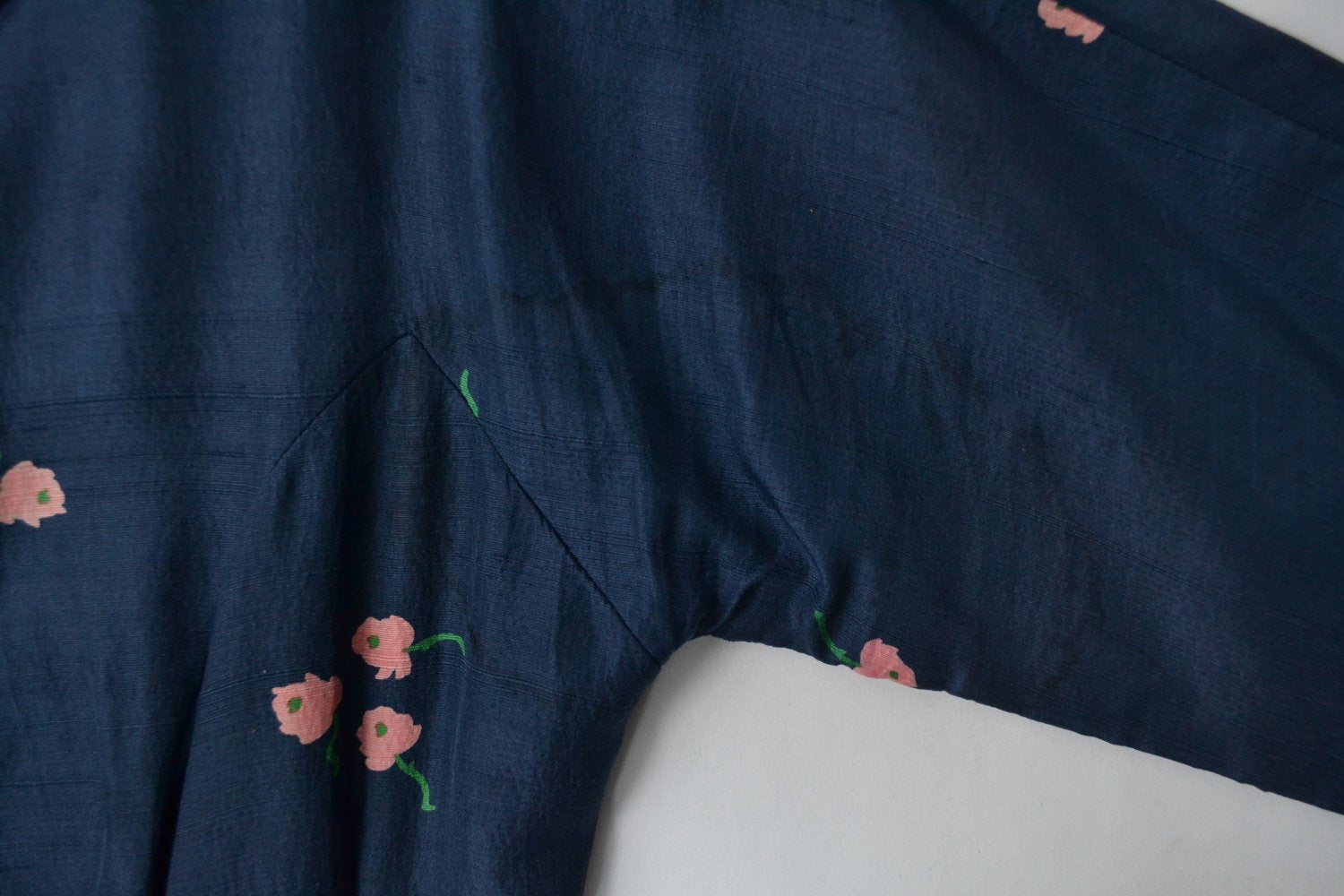 Navy silk dress circa 1950s. Features pink and green flower print, full skirt and two side pockets. Zips up back with a 13" metal zipper, hook and eye clasp at top. In beautiful condition, some water marks in underarms (not noticeable on dark fabric, see last image.)