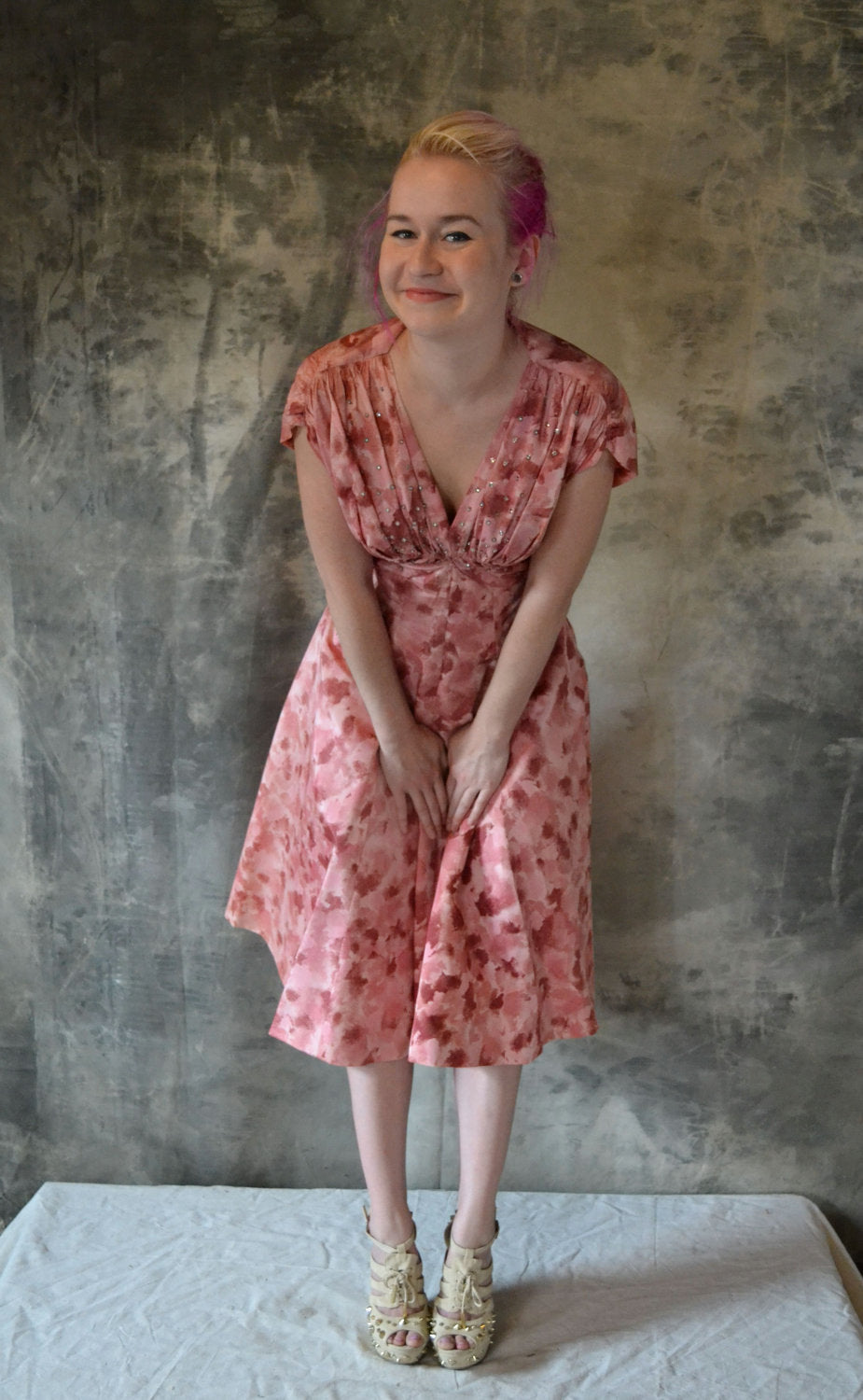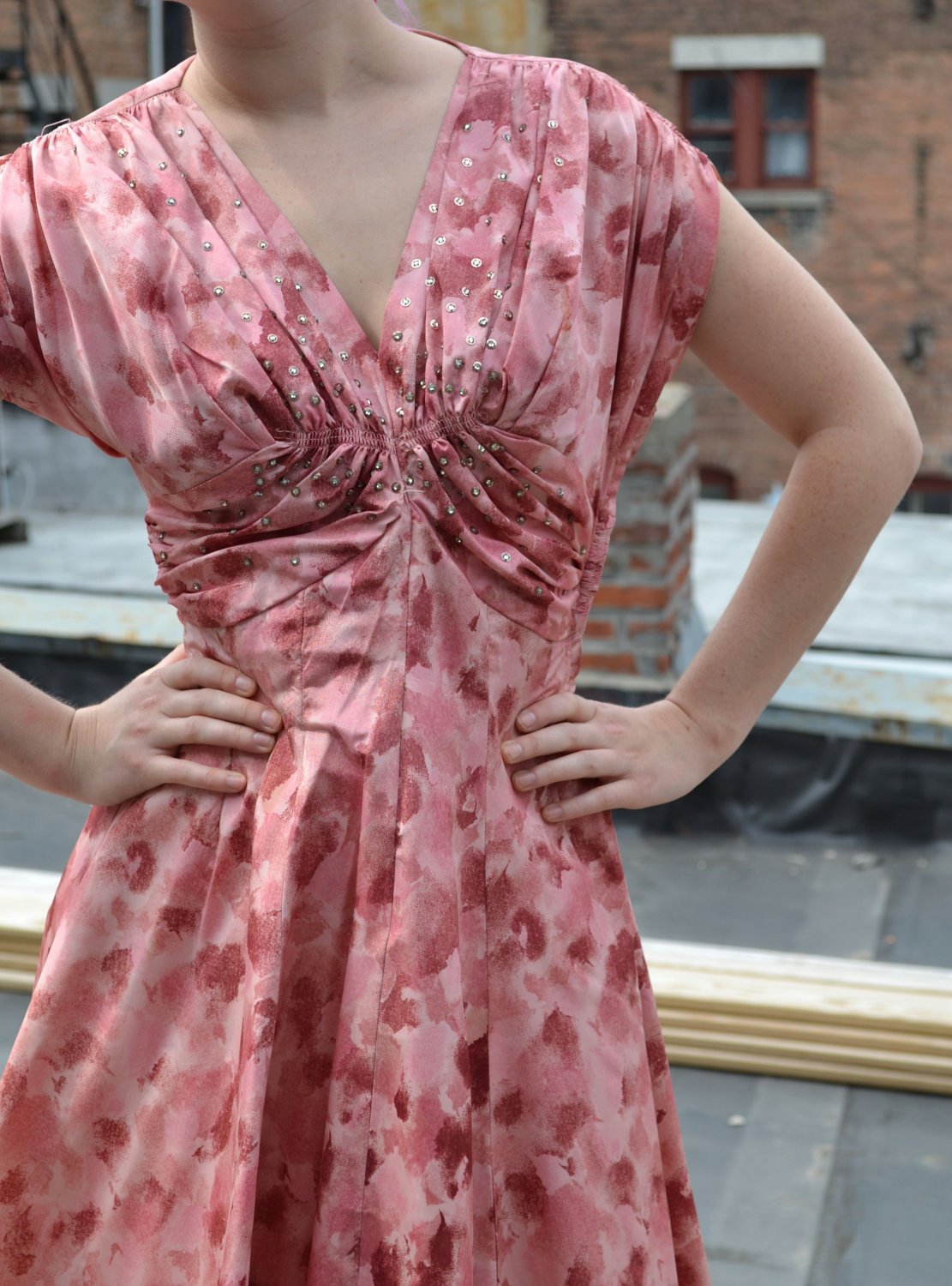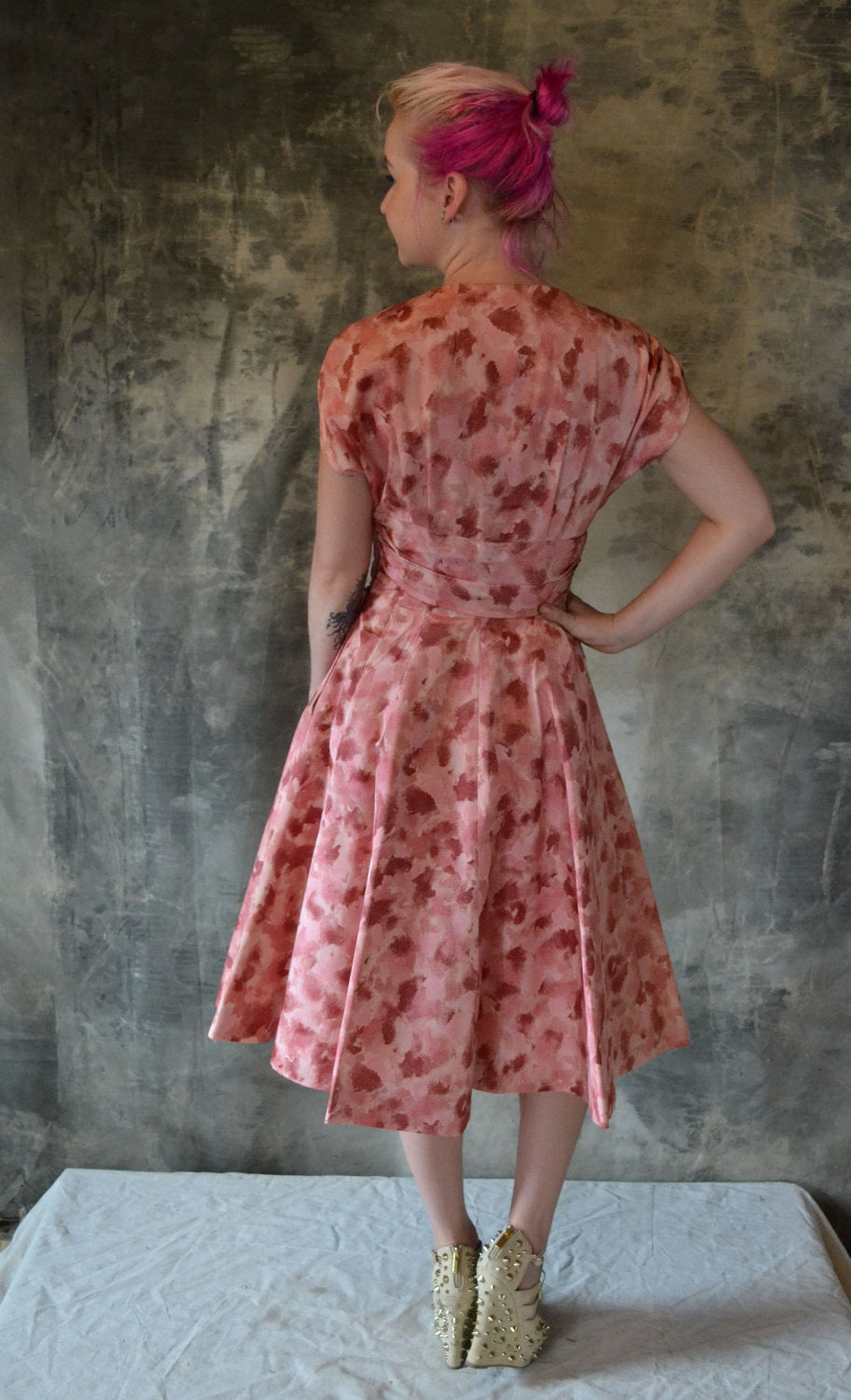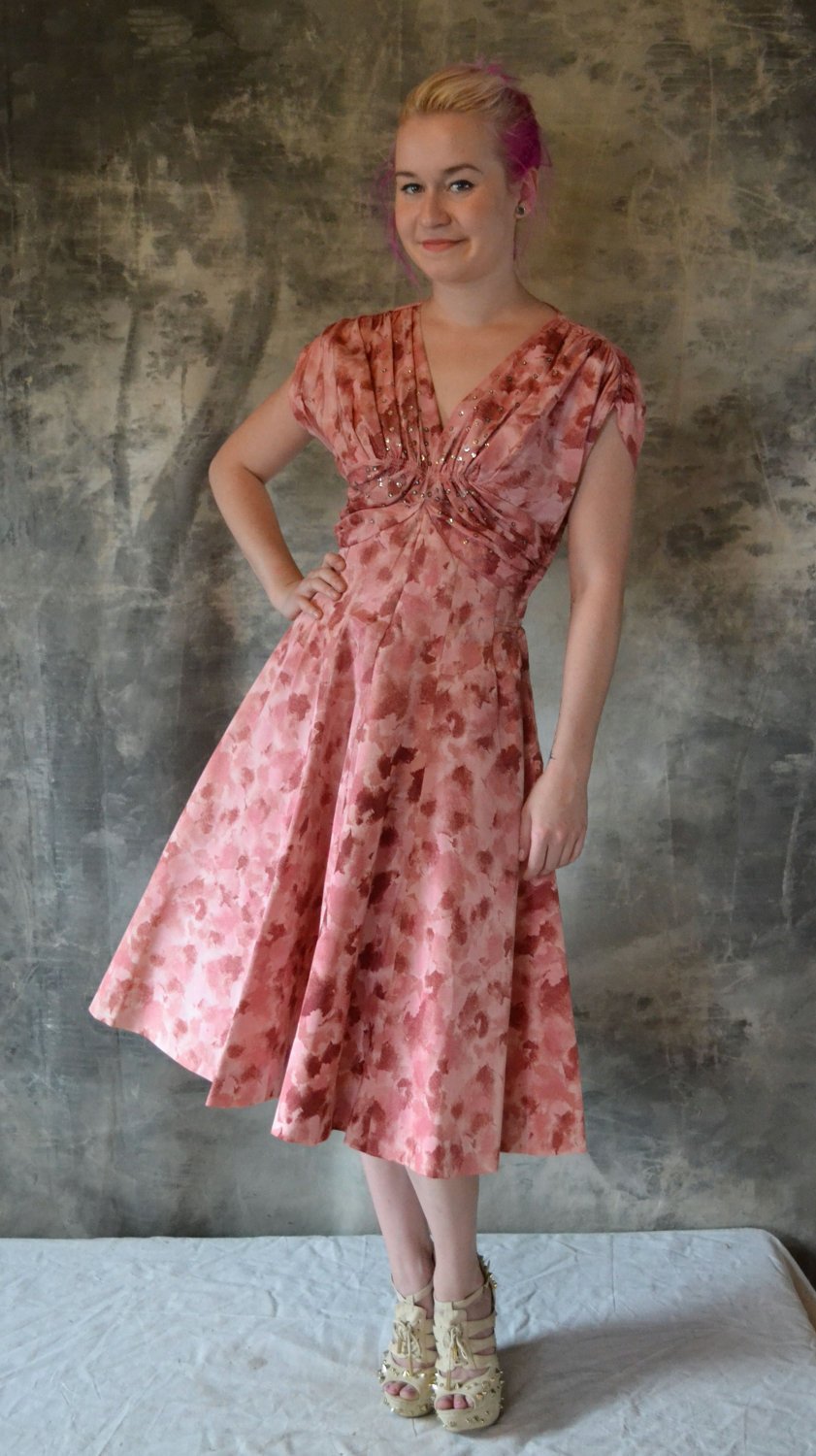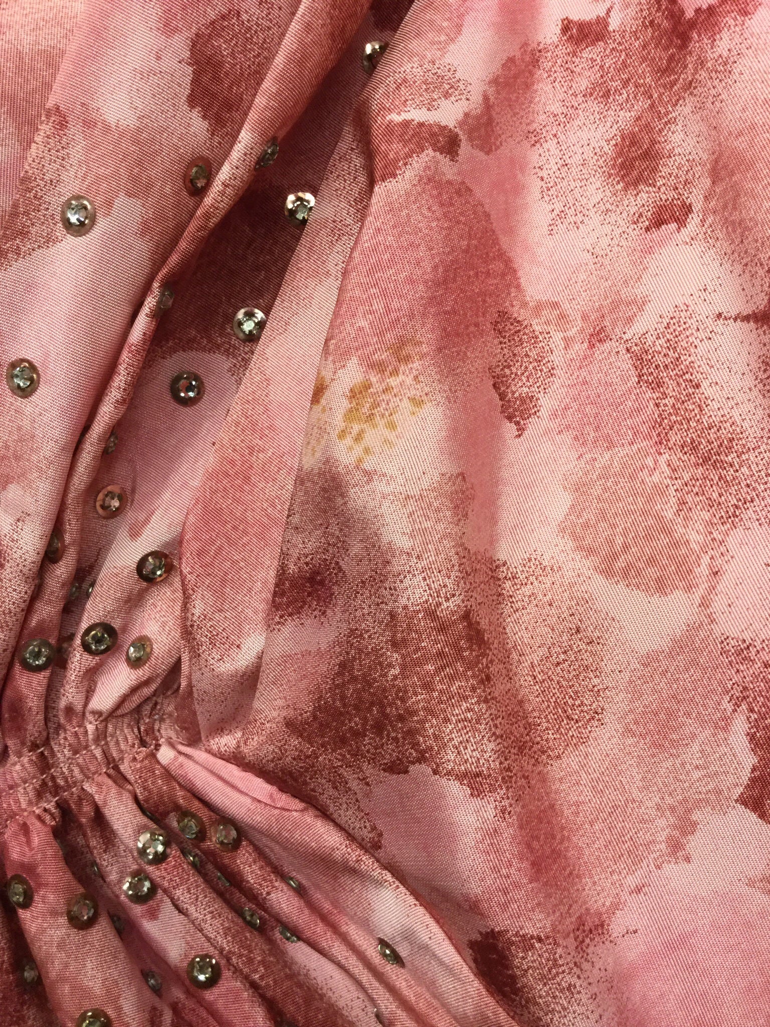 This blush-pink tea length dress is absolutely darling. Perfect for afternoon tea, a garden party, or a spring/summer wedding. Patterned with a soft, impressionistic rose petal print. The bodice is beautifully ruched and embellished with rhinestones. Elegant, chic, and fun. In great condition with some faint stains (see last image.)