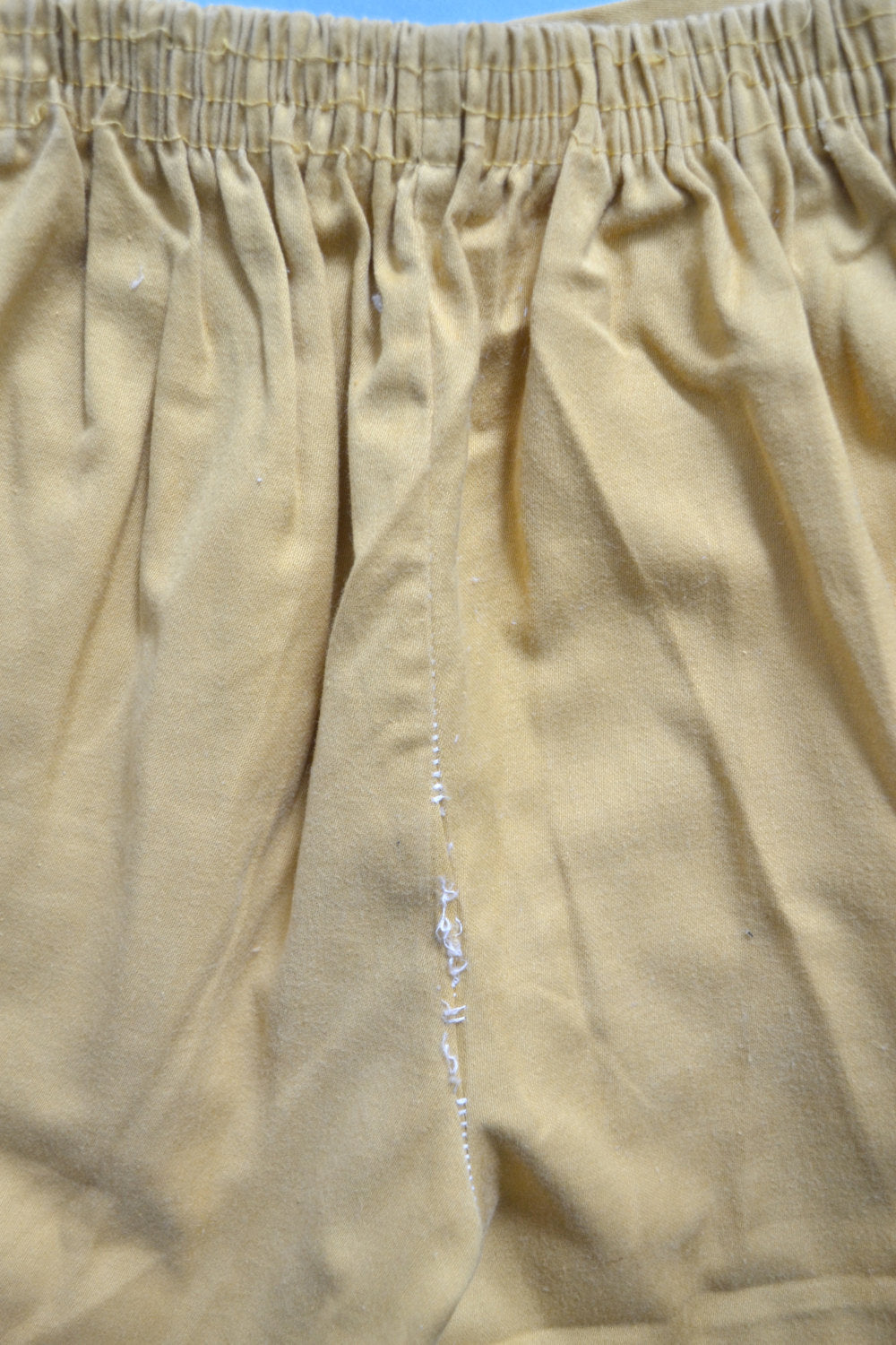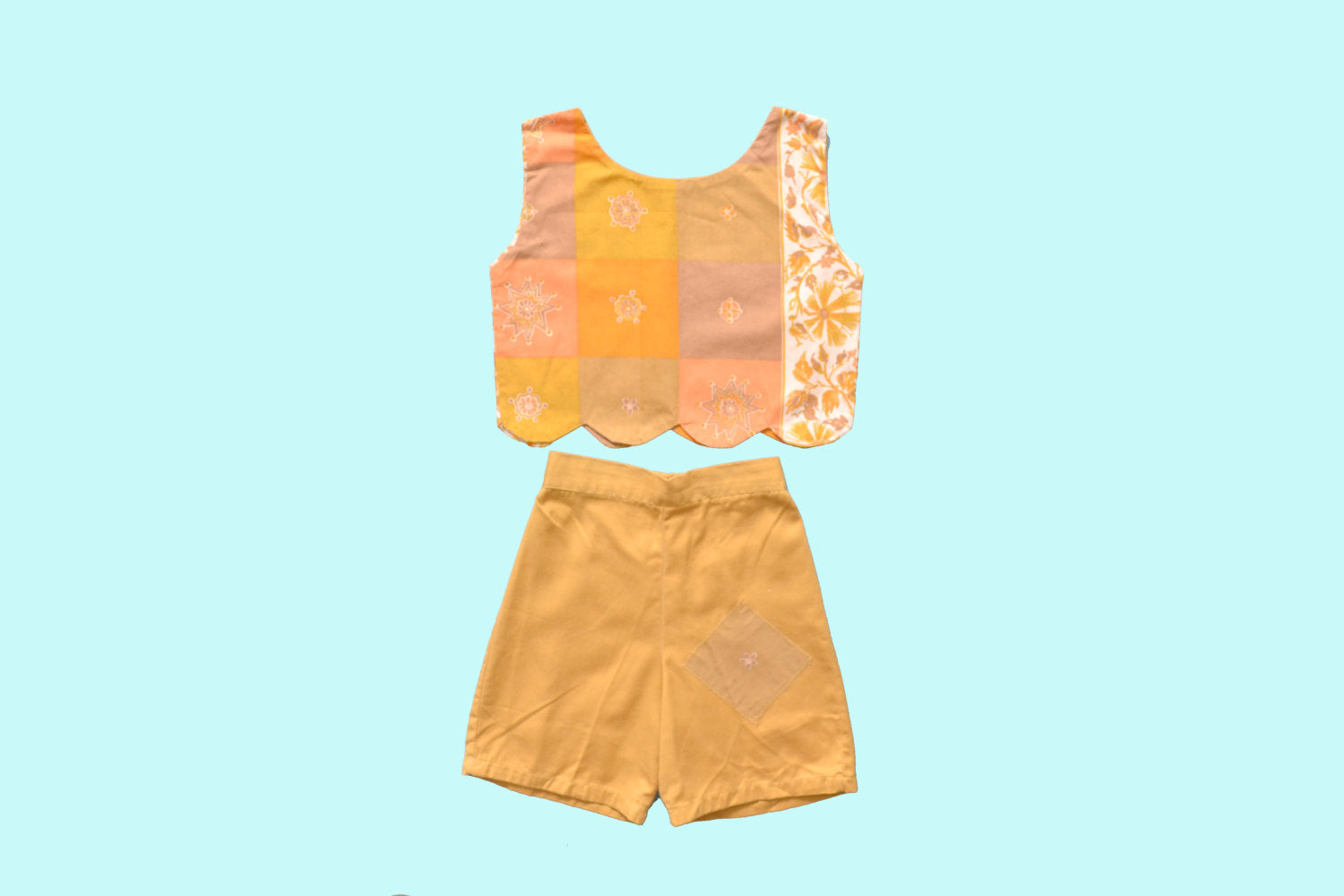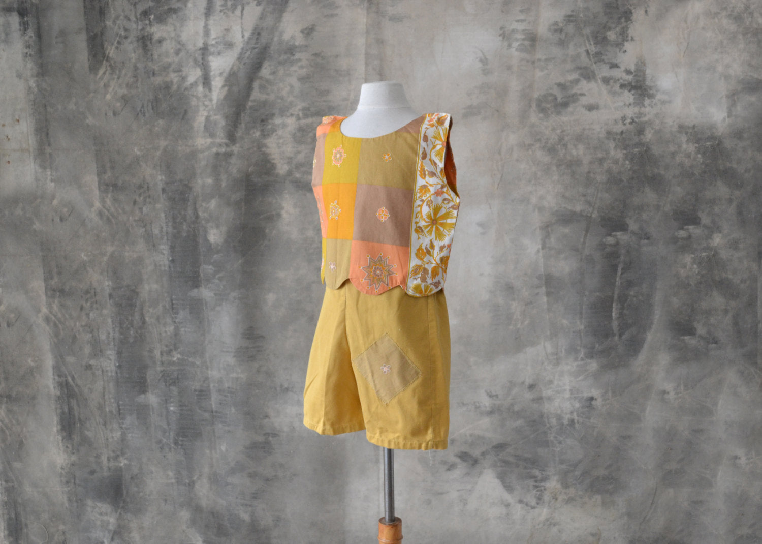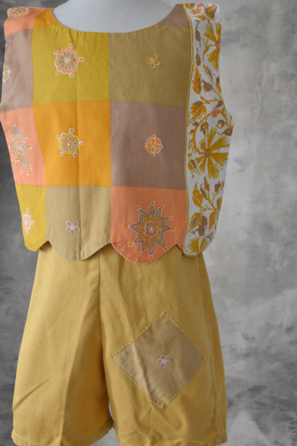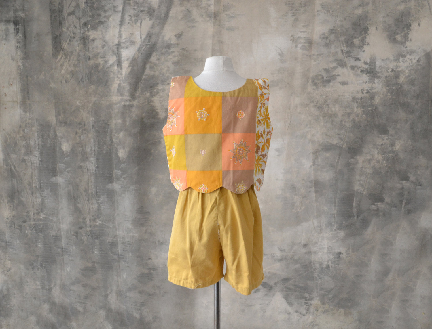Mustard yellow and orange child's two piece set. Tank with scalloped hem and shorts with decorative patch. Good condition with some pulling to seam of shorts (last image)
