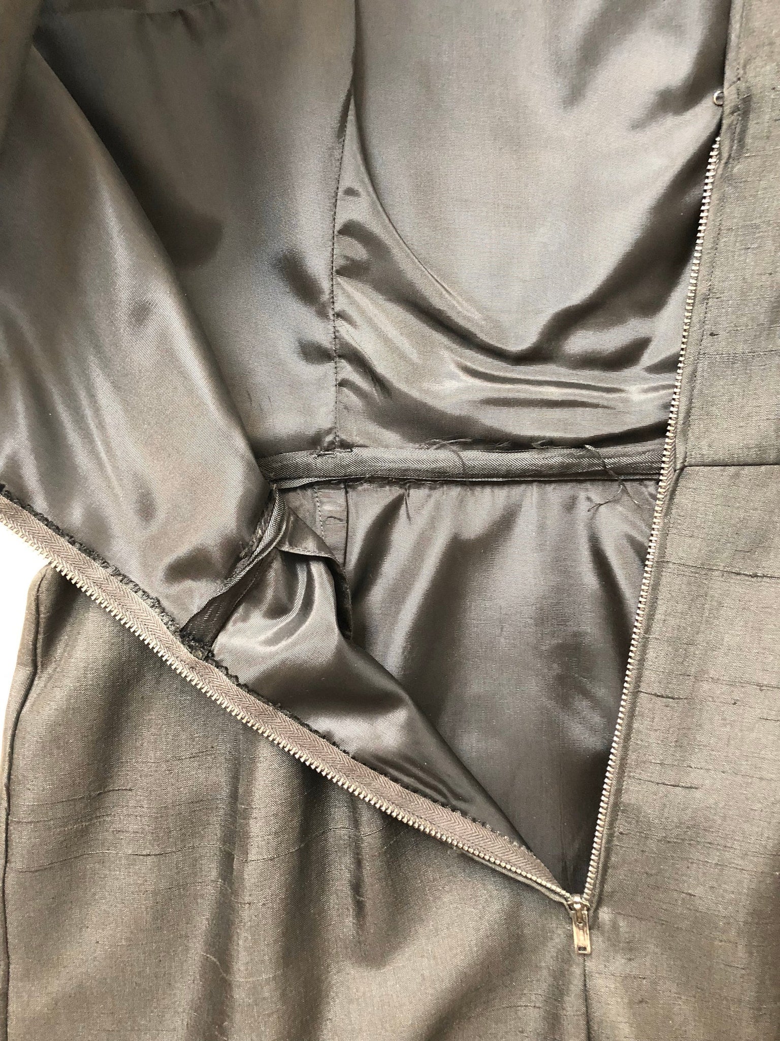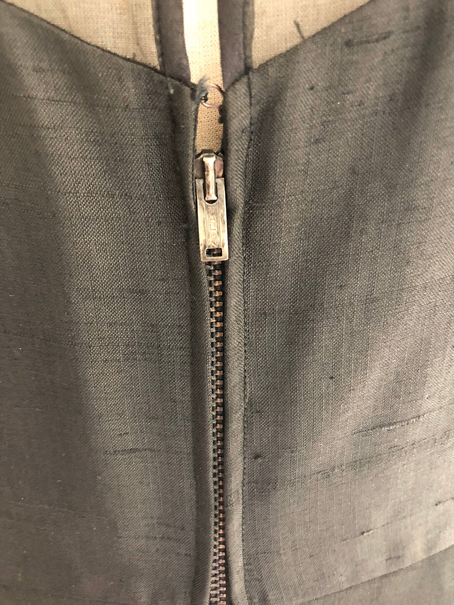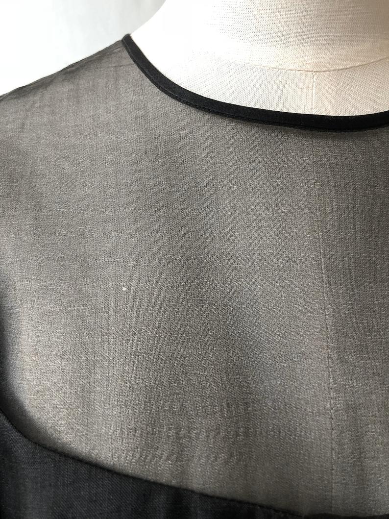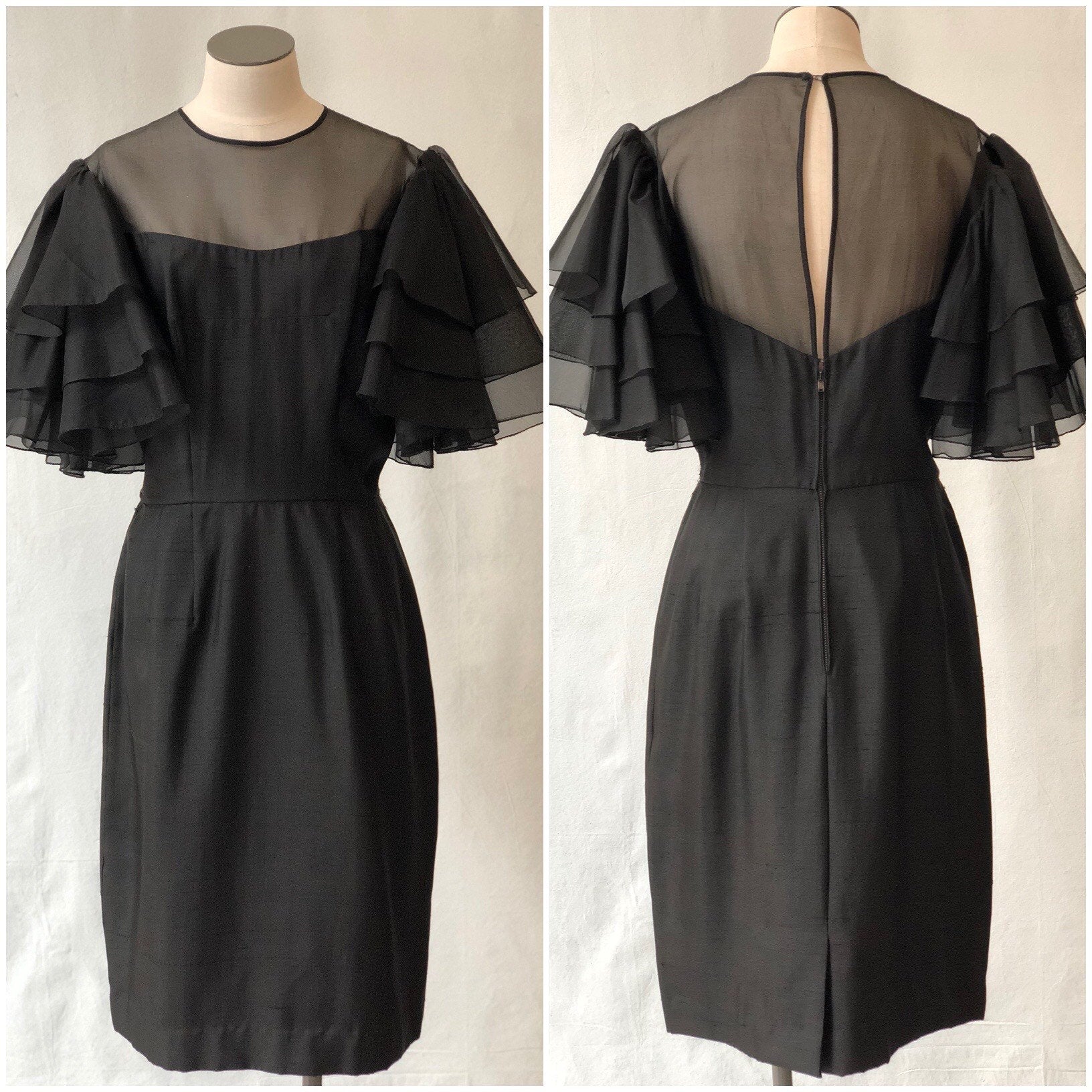Lovely and fun black 1960's cocktail dress! This dress has a cinched flattering waistline and a mesh neckline that goes over the front and the back. Keyhole back with zip. Hits just below the knee. Room on hem to adjust length if necessary. Sleeves are made of Silk Georgette.