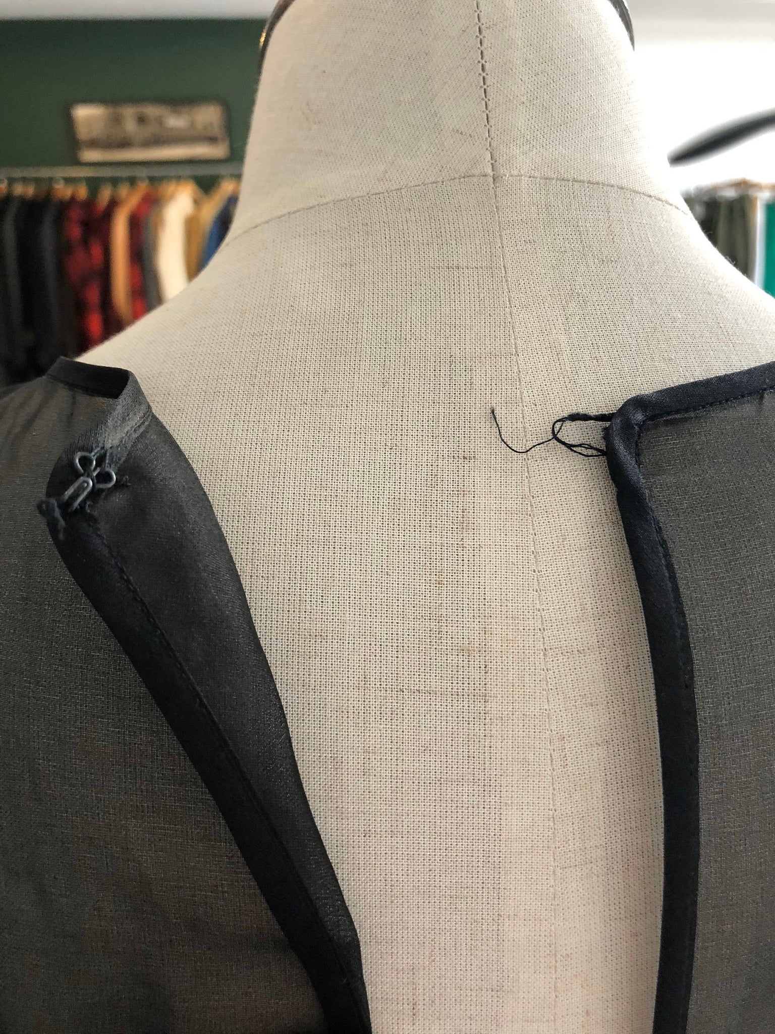String for clasp at back of neck torn, rip on right shoulder (where sleeve connects to top) Priced as is.