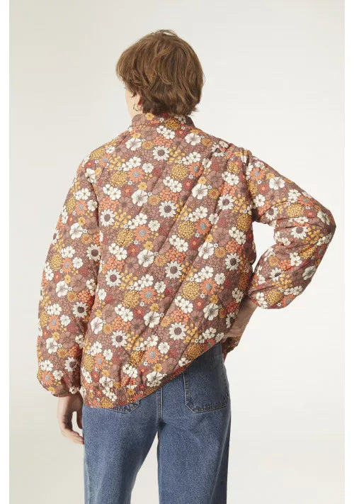 Bomber-style jacket with autumn floral print. Round neck and long sleeves. Central zip fastening and hidden buttons with press studs. Jetted pocket detail. Model is 174cm tall and wears size S.