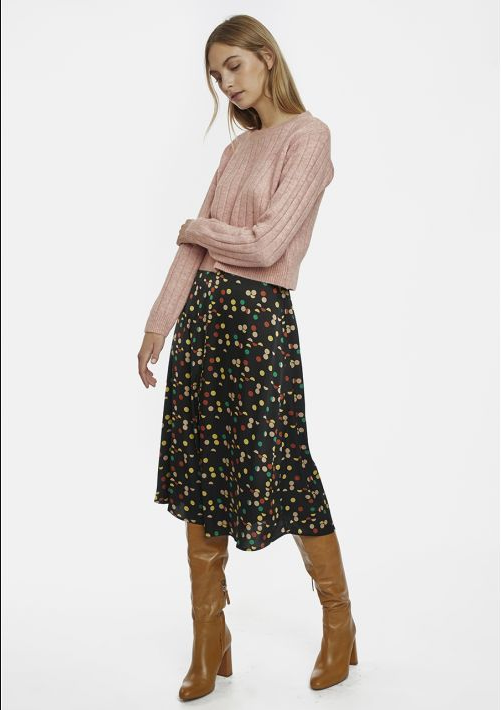 Pink ribbed knit jumper. Round neck. Long sleeves. Front buttons. Model wears size S.