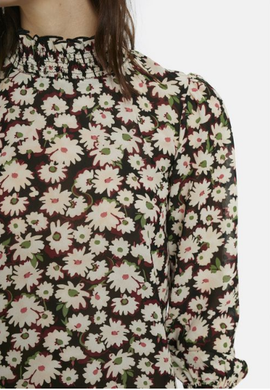 Black blouse with white daisy print. Diaphanous fabric. Victorian-style collar with smocking. Long flared sleeves with elasticated smocked detailing. Closure at the back with slit and buttons. Model wears size S.