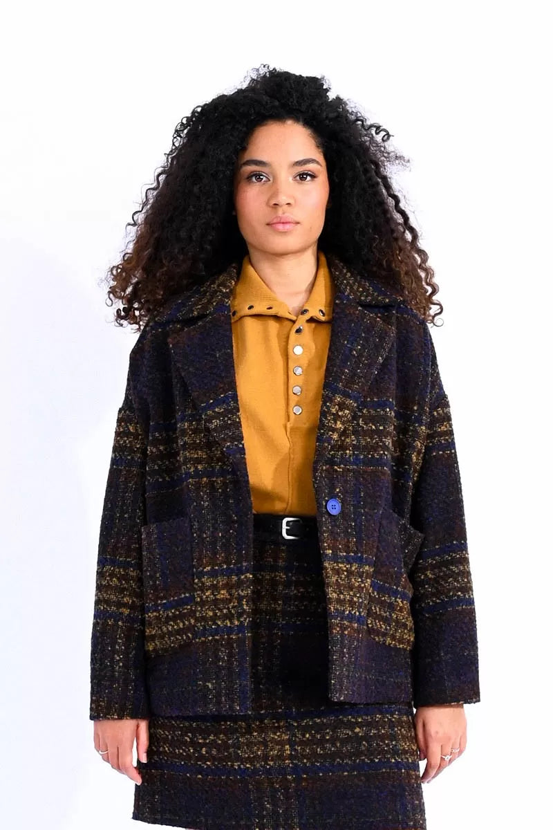 Short and wide coat in check pattern, with patch pockets on the sides, lapel collar, and low armhole.