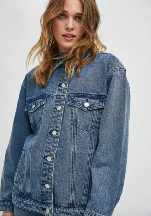 Blue oversized denim jacket. Lapel collar. Long sleeves. Front jetted pockets and side patch pockets. Front metal buttons. Model wears size S.