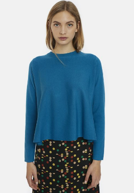 Blue fine·knit smock sweater. Ribbed round neck. Long sleeves. Model wears size S.