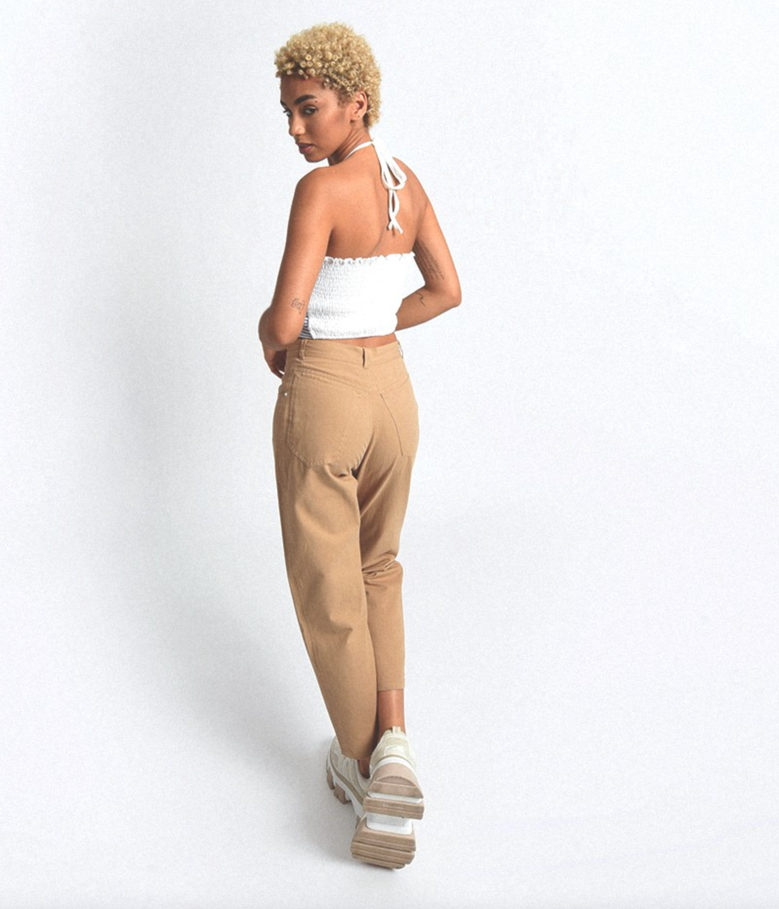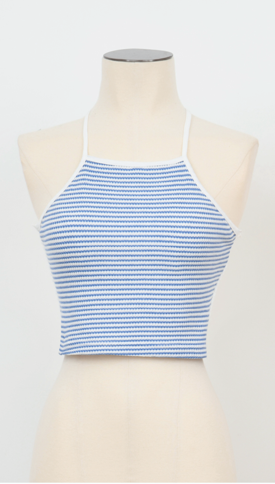 Ribbed cotton top with thin straps to tie at the neck, and a fine striped pattern.