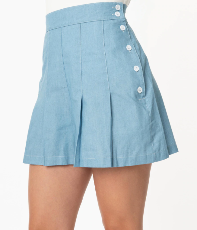 These sweet shorts from Unique Vintage are crafted in a fabulous light blue chambray to keep you cool as you sizzle. The Joyce Shorts boast a delightful button-up side and darling pin tucks for charming vintage style. Complete with a cute coin pocket for function as you frolic!
