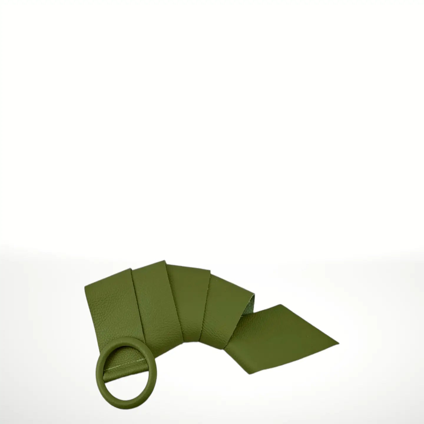 This genuine leather belt is designed to add a sophisticated and original touch to any outfit. Its wrap-around design with a leather-covered buckle allows it to be comfortably adjusted to the waist, highlighting the silhouette with an elegant and versatile style.