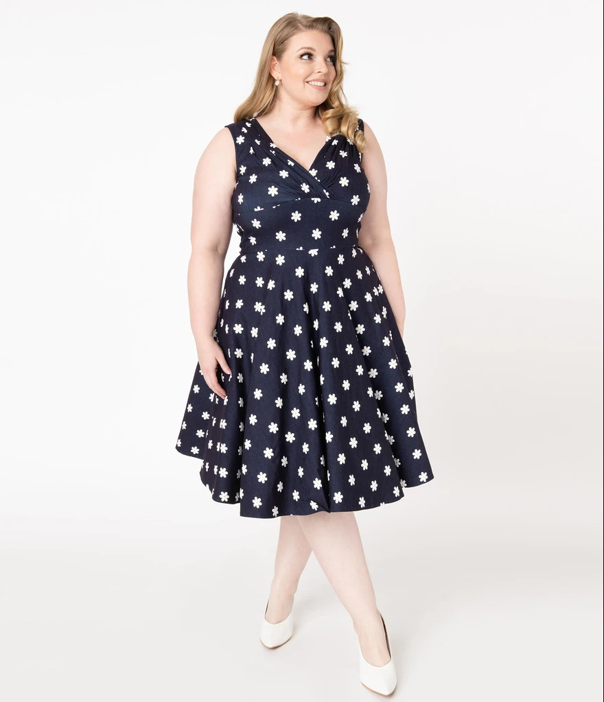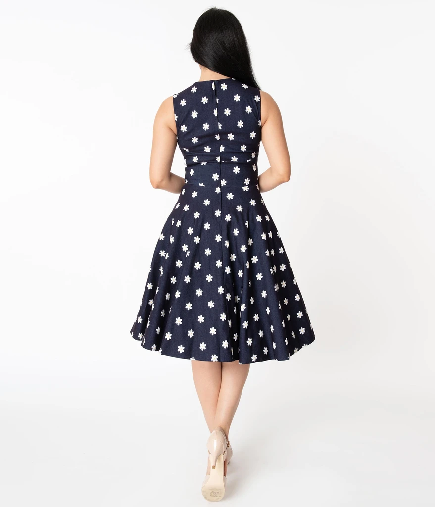 A brilliant canvas for fabulousness, the Delores Dress is crafted in a gorgeous stretch fabric that flatters your silhouette in classic dark blue denim and dances with screen printed white daisy florals throughout. Fresh from Unique Vintage, this 1950s style dress boasts a sultry pleated surplice neckline that drops into a wide banded waist that slims and elongates your feminine figure. The enchanting sleeveless design keeps you free for frolicking while the sweeping swing skirt drops to a straight hem. Outfitted with a back zipper, it’s a dream of a dress!