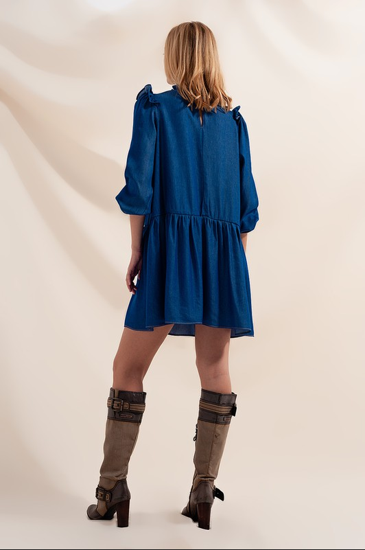 Comfy mini dress with volume sleeves, tiered skirt, and smock style, in a light chambray denim.