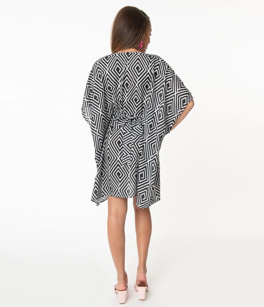 This sweet caftan dress from Smak Parlour is crafted in a dreamy, lightweight fabric that dances with a retro black and white diamond pattern. The sultry V-neckline is framed by sweeping half sleeves and is nipped in the waist with self ties for a marvelous fit. Complete with a flirtatious hemline that drops above the knees to show off your frolicking struts! Available in One Size.