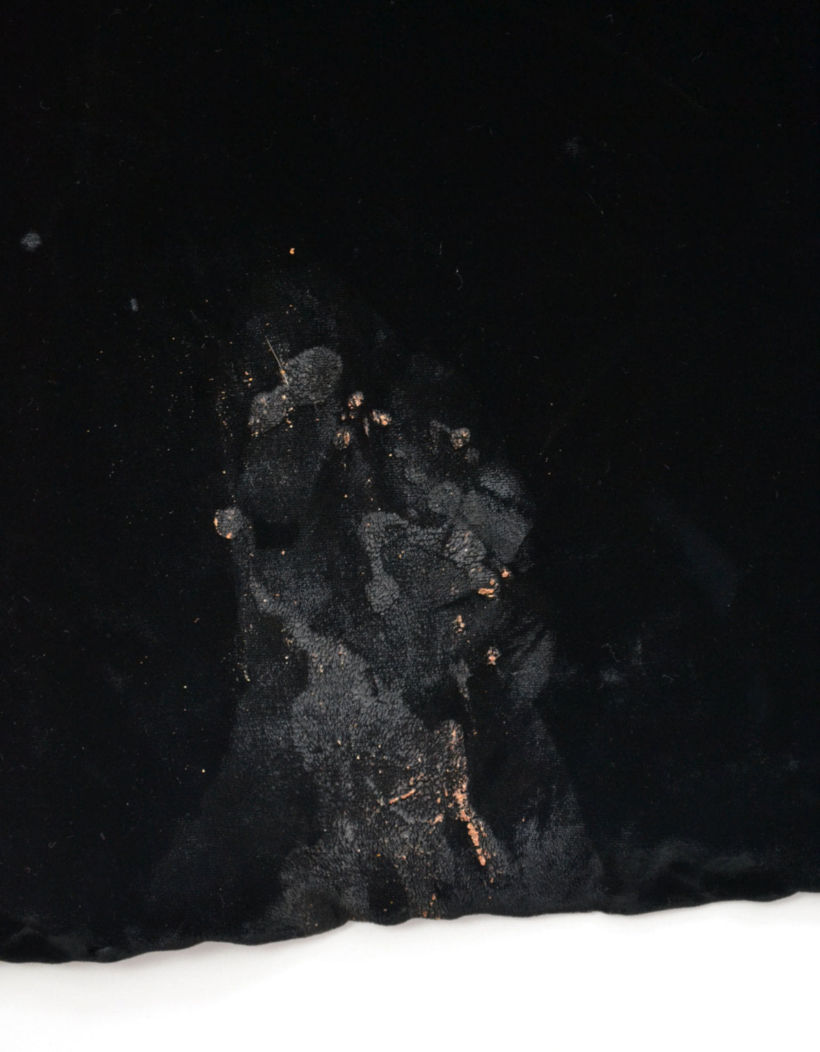 Long black velvet jacket circa early 1900s. Made from silk velvet, fully lined in off-white satin. Features large slouchy sleeves with stitched pleated detail (some stitching is coming unraveled) two buttons, one at waist and one at collar (can be worn open) In good condition for it's age: some repairs made to tears in velvet, stain near hem on right side (last image) stitching detail in sleeves is coming unraveled.