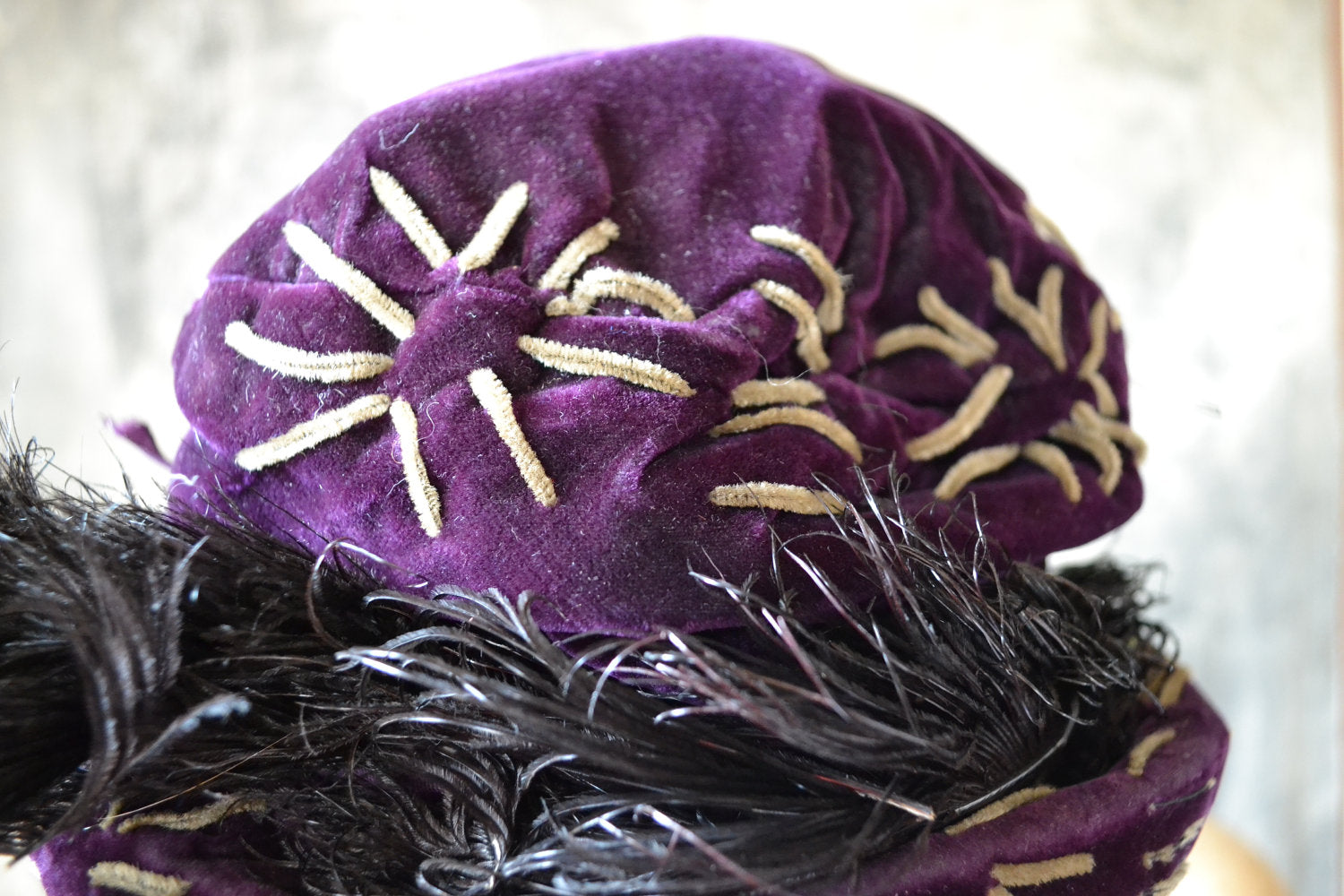 Fabulous Edwardian purple velvet hat with large black feather. Features beige piping decoration and purple silk ribbon around brim. In good condition for its age with some wear around brim as shown.