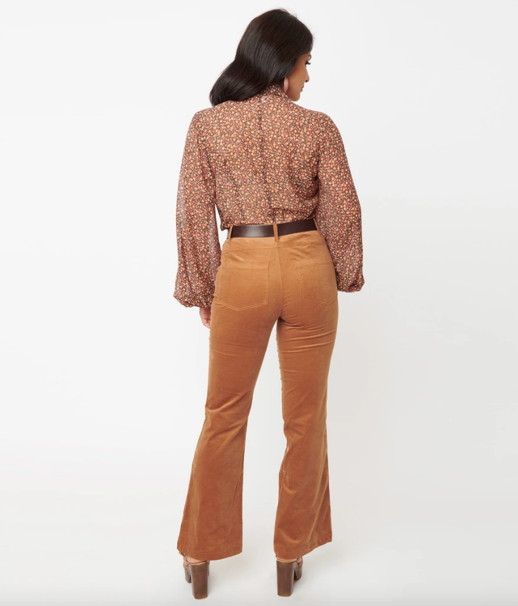 Trailblaze your way to the top in these sensational pants from Unique Vintage, crafted in a sultry golden tan corduroy for marvelous retro styling. These pants are cinched with a front zipper and button and highlighted with an eye-catching belt while side and back pockets keep your tools close at hand. Complete with a subtle flare for groovy vintage vibes!