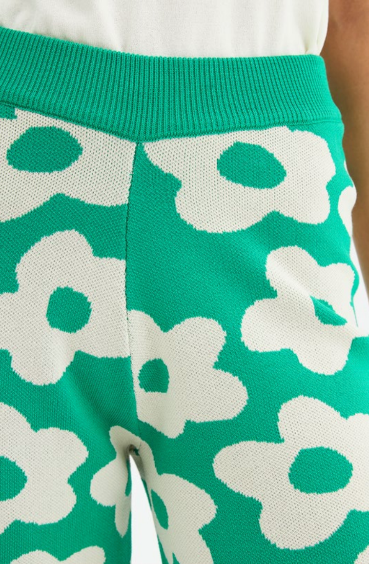 Knitted trousers with a flower print. Mid-rise elasticated waist.