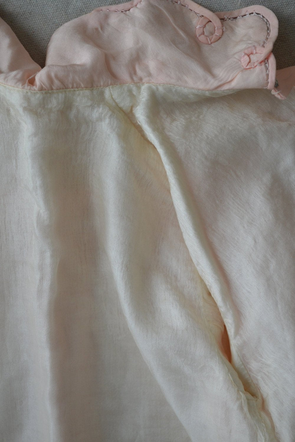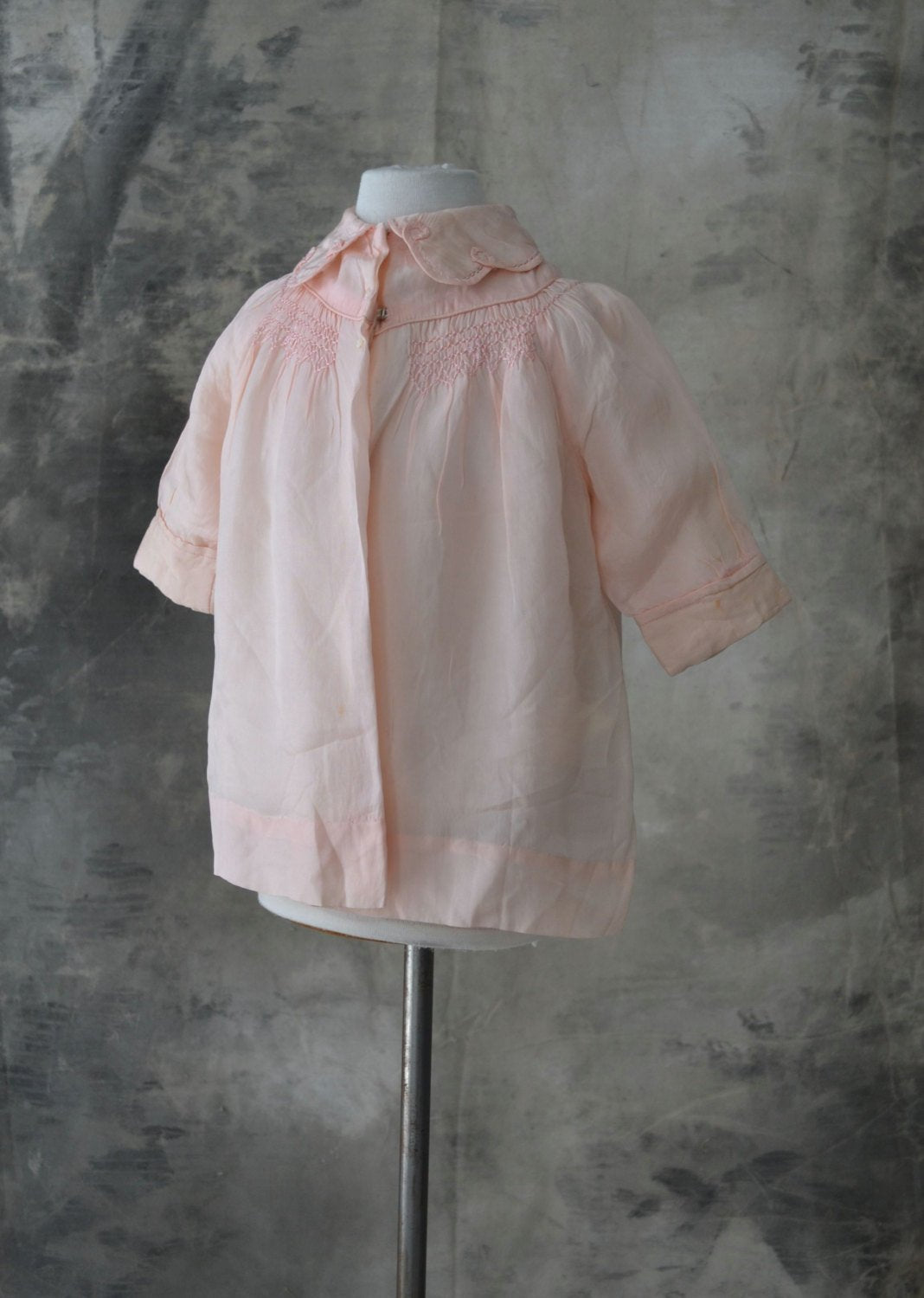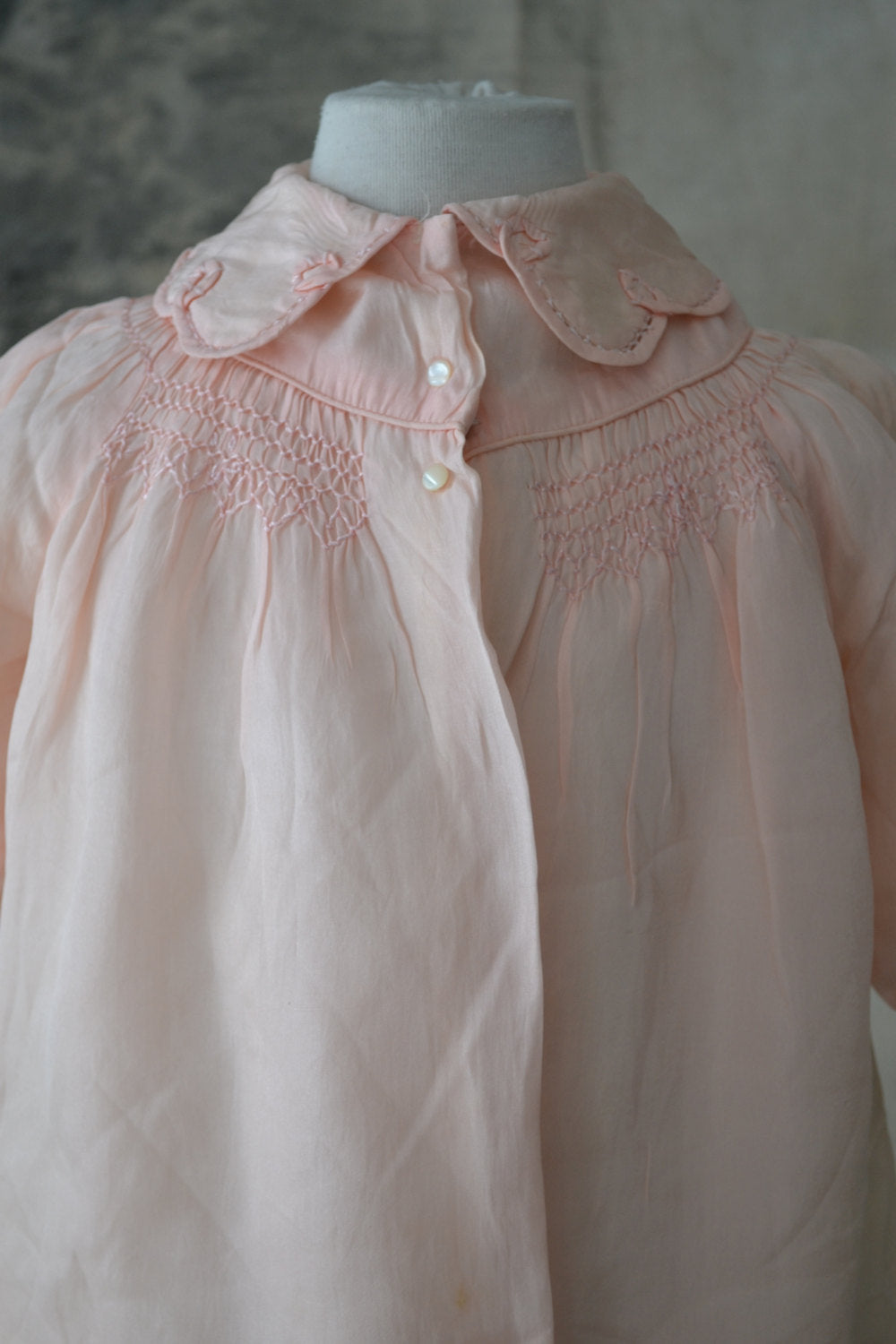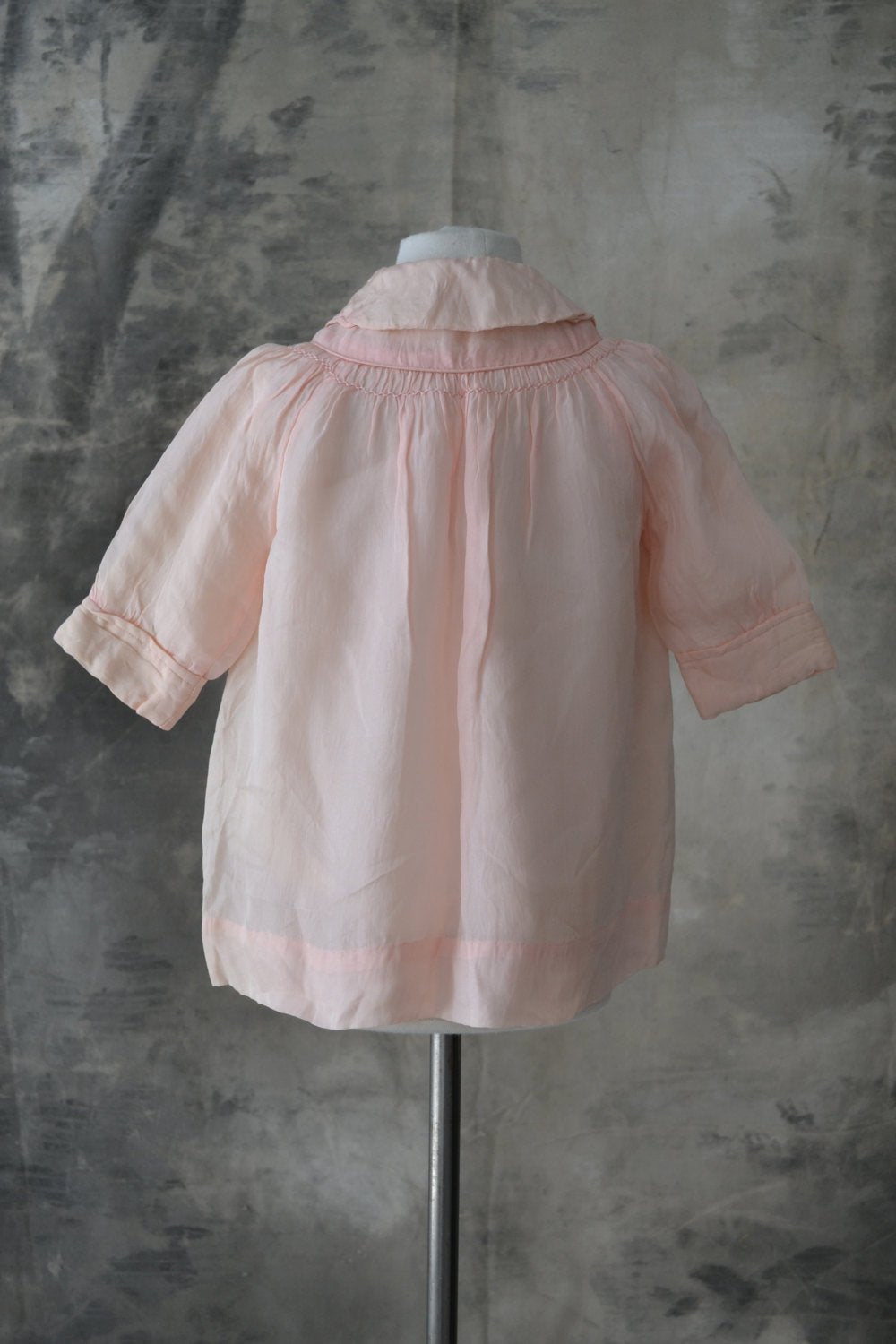 Pale pink silk child's blouse hand made from a soft pink silk with white cotton backed silk lining. Two snaps at neckline with decorative mother of pearl buttons, gathered pleating around collar, with decorative stitching. In beautiful condition with one faint mark on sleeve.