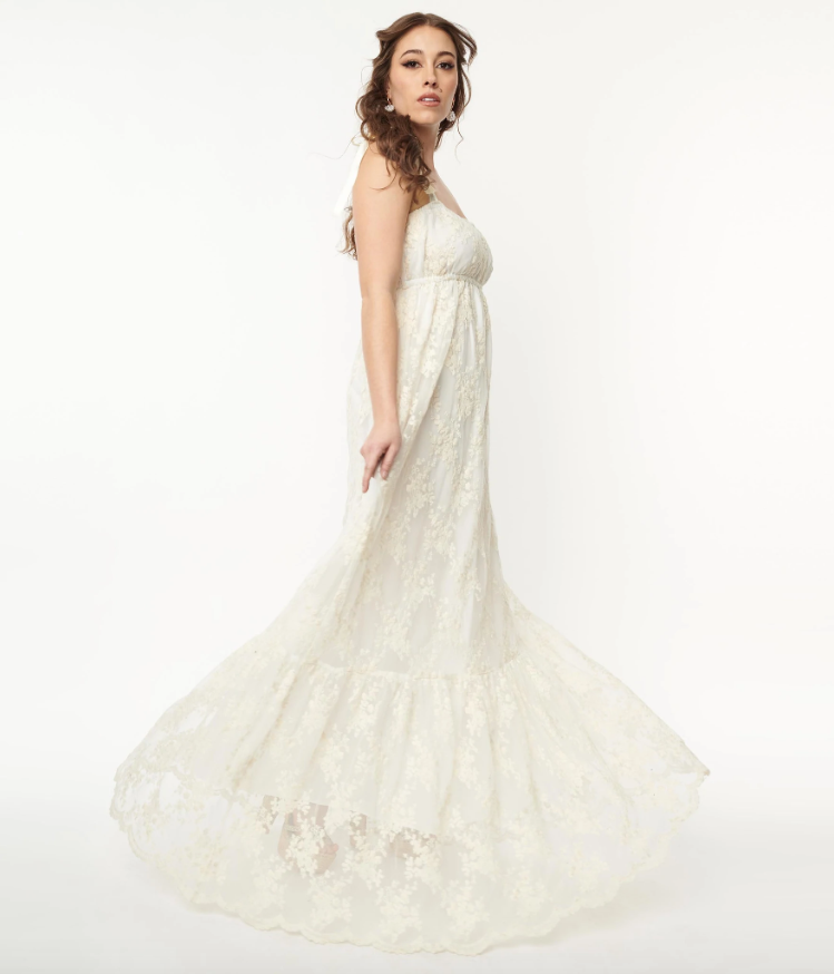 This heavenly maxi is crafted in an ivory cream mesh that boasts a bounty of embroidered florals throughout. The sultry elastic neckline is secured with self tie cream ribbons while the sweeping maxi skirt cascades over long white lining!