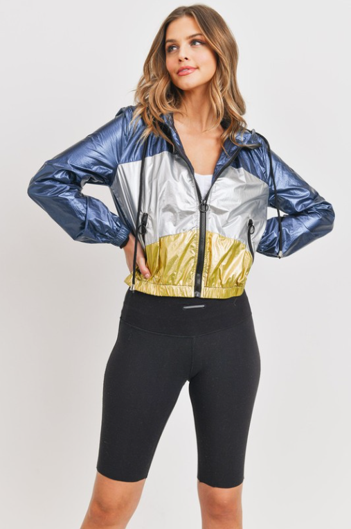 Metallic colorblock jacket with drawstring hoodie, long sleeves, banded cuffs, zip up closure, front pockets with zipper, and elastic hem.