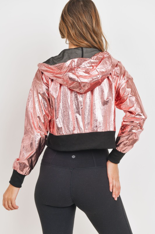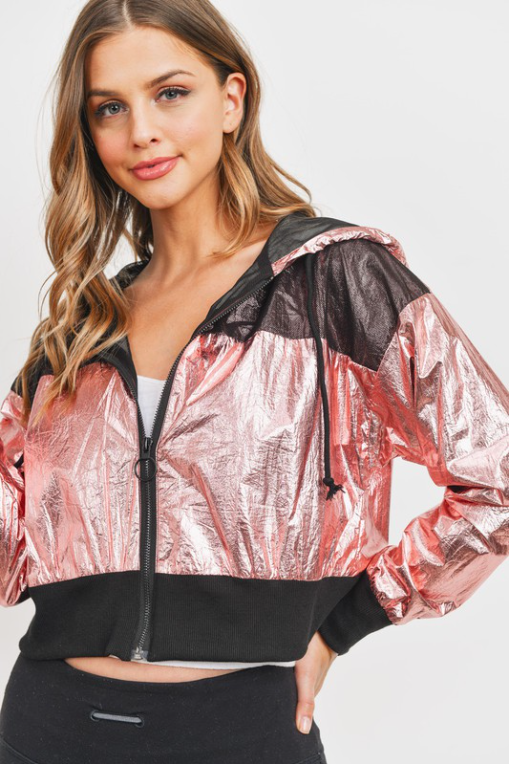 Metallic mesh crop jacket with hood, drawstrings, long sleeves, banded cuffs, mesh detailing, and front zip up closure.100% Polyester